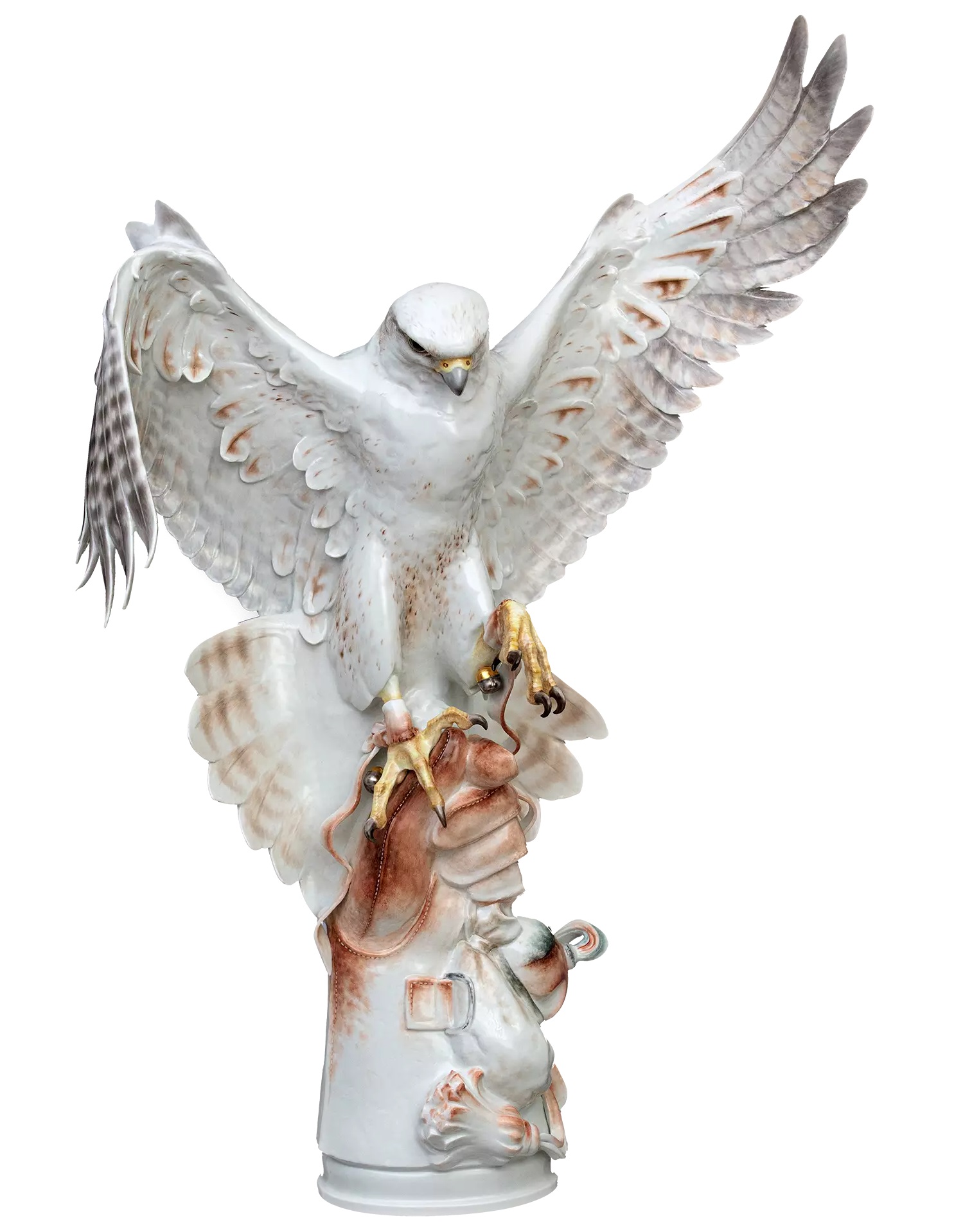Exklusive FigurenEine atemberaubende Momentaufnahme des auf dem Handschuh des Falkner's landenden Falken. Dem jungen Plastiker Maximilian Hagstotz gelingt es bei der Figur auf spektakuläre Weise, Anmut und Kraft des "König's der Lüfte" exklusiv einzufangen. Die Skulptur vollbringt die Ausstrahlung von Leichtigkeit trotz gleichzeitiger Schwere. Der Fokus des 75 cm hohen Kunstwerk 's liegt auf den detailreich ausgestalteten Krallen der Figur, handbemalt von Malerin Kerstin Laschinksi. Die filigrane Arbeit trägt zu einem lebensechten Aussehen der Skulptur bei. Kraft und Rhythmus ausstrahlende feine Ornamentik der Rückenfedern, ebenfalls handbemalt, verstärkt die Wirkung. Ein beeindruckendes Kunstwerk der MEISSEN® Exklusiv-Kollektion. -
