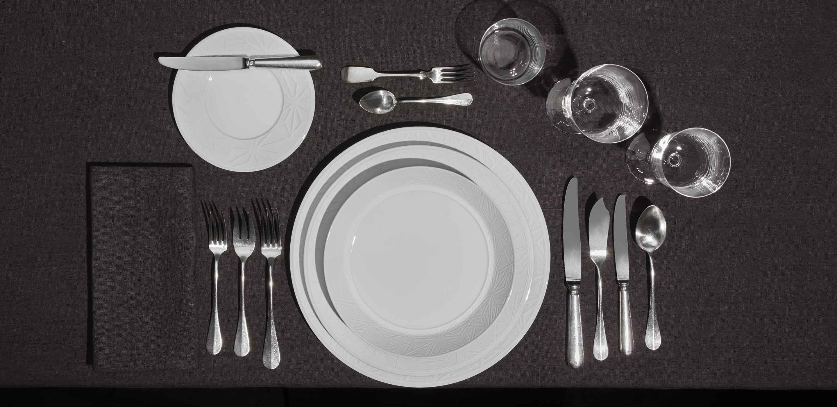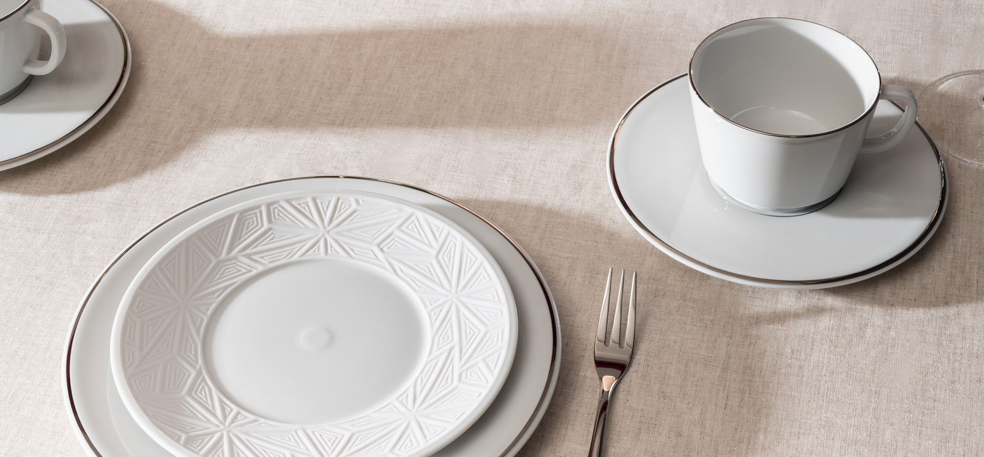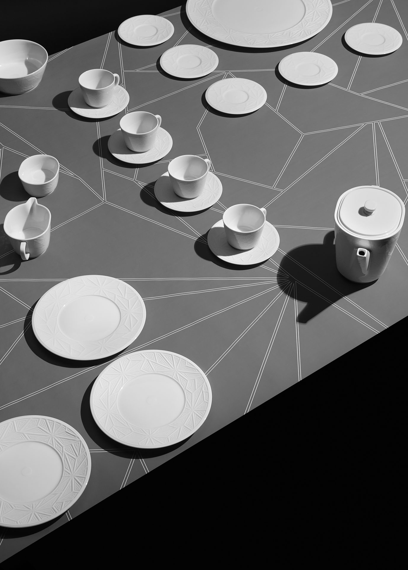 „Graphic“, ein eigens entwickeltes Relief übersetzt die Formensprache in ein grafisches Muster, welches in unterschiedlichen Varianten auftritt. Ähnlich sich spiegelnden Prismen verleihen sie dem Porzellan eine schematische Struktur und spannungsreiche Haptik. Der Ming-Drache, einer der beliebtesten Dekore der Manufaktur, entstand um 1910 und wurde von asiatischen Vorbildern inspiriert. Eine harmonische Re-Interpretation findet sich nun im Service VITRUV und dem Dekor „Ming Dragon“ in elegantem Schwarz wieder. In detailreicher Handmalerei dynamisch auf Vorspeise- und Dessertteller platziert, verleiht er der klaren Form einen erhabenen Charakter und unterstreicht die Zeitlosigkeit des Designs.