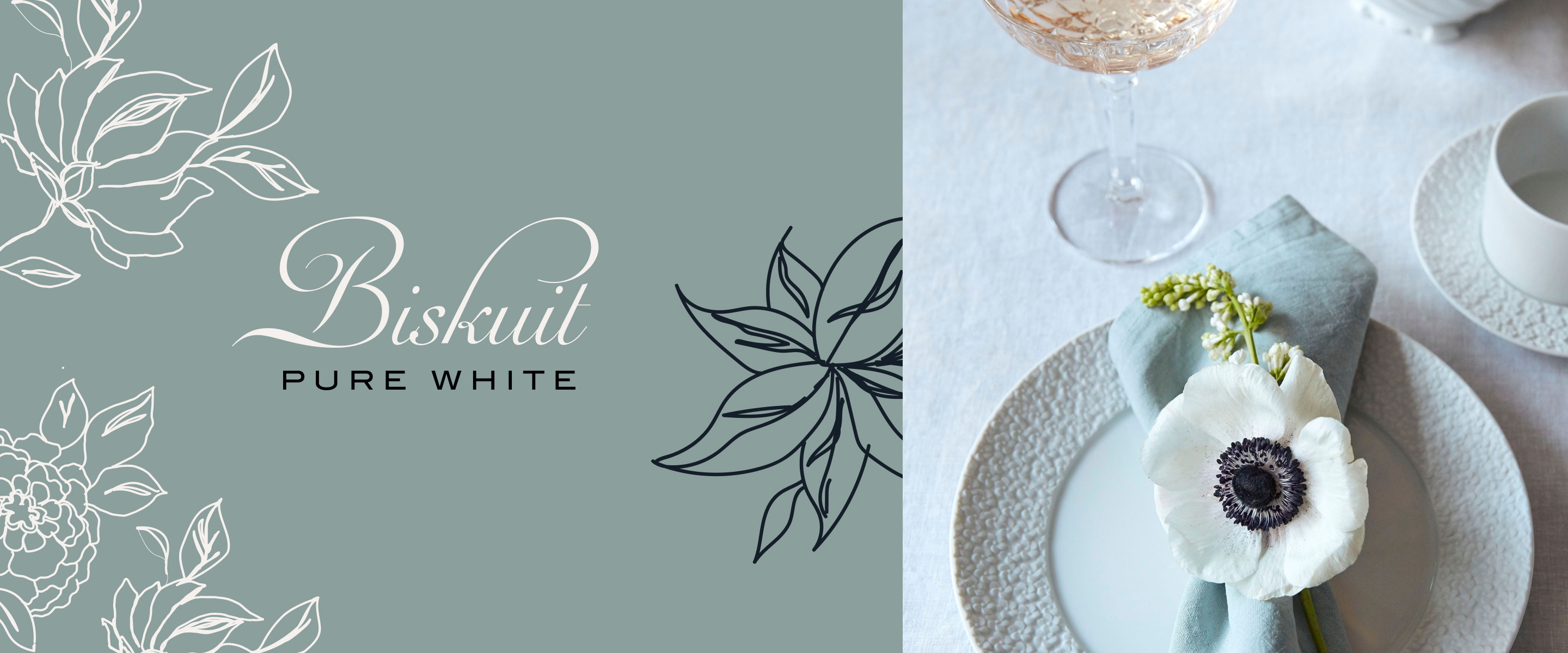 Das pure Porzellan. Tatsächlich besitzt Biskuit die gleichen Eigenschaften wie glasiertes Porzellan in Bezug auf Dichte, Härte, Festigkeit und Widerstand. Darüber hinaus kommen in Biskuit die Fertigkeiten der Meissener Kunsthandwerker besonders eindrücklich zur Geltung. Durch das Auslassen der Glasur des Porzellans treten Details – Ausformungen, aufwendige Bossierarbeiten und Verzierungen wie Reliefs – besonders akzentuiert hervor und schaffen einzigartig haptische Erlebnisse. So werden immer wieder Porzellane mit besonders aufwendigen Verzierungen, wie etwa aus dem „Schwanenservice“, der Kollektion „Wellenspiel“, der „Royal Blossom“ Serie in der „N°41“ Kollektion oder der „VITRUV“ Kollektion in Biskuit umgesetzt und die Potentiale des Porzellans gänzlich ausgeschöpft. Im Mix und Match mit glasierten Stücken jeweiliger und auch anderer Kollektionen oder auch bemalter Porzellane sind dem individuellen Arrangement keine Grenzen gesetzt.