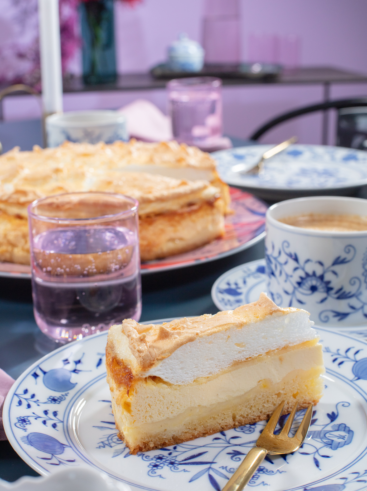 Schritt 3: Den Kuchen im vorgeheizten Backofen bei 180 °C Umluft für 40-50 Minuten backen. Kurz bevor die Zeit abgelaufen ist, den Eischnee aus Eiweiß mit etwas Zitronensaft und Zucker schlagen und auf dem Kuchen verteilen. Anschließend weitere 15 Minuten goldgelb backen.