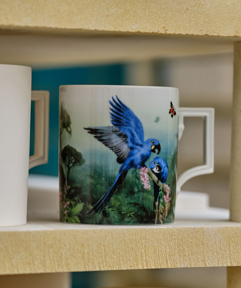 fünf einzigartige Mugs mit den Motiven der Wandbilder und der Vase „Amazonas“ erweitert. Eines der Motive, der schwarze Panther, wurde exklusiv für diese Henkelbecher-Kollektion gemalt. Dieser Bewohner des Regenwaldes ist eigentlich ein Jaguar mit durchgehend schwarzer Fellfärbung – wobei die Bezeichnung auch auf Leoparden mit dieser Eigenschaft zutrifft. Majestätisch fügt sich das Raubtier in die Szenerie ein.