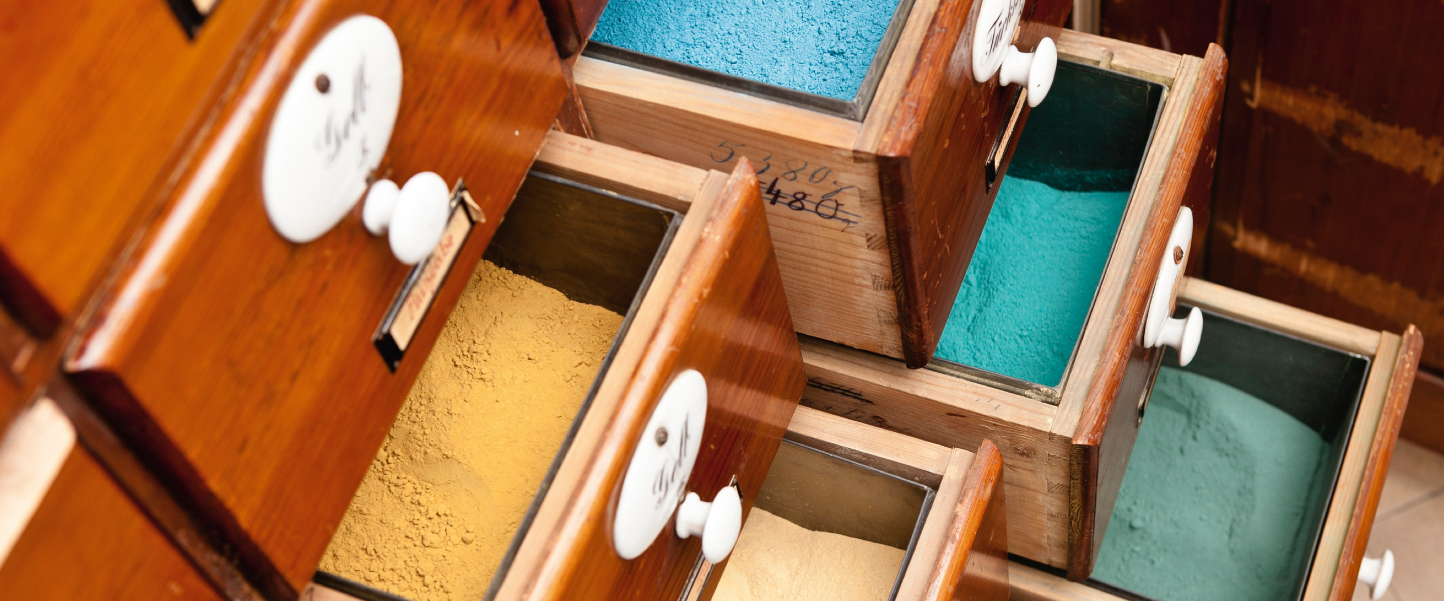 Ein kleiner, von außen fast unscheinbarer Raum auf einem der vielen Manufakturgänge, gefüllt mit Holzregalen, Schubladen und Filmdosen, in denen sich verschiedene Farbpulver befinden, schützt das Geheimnis unzähliger Rezepturen und ist nur wenigen Mitarbeitenden zugänglich. An eine Apotheke aus früheren Zeiten erinnernd, ist jede Schublade mit einem Schild versehen, welches die Bezeichnungen der Farben zeigt: Kaffeebraun, Kastanienbraun, Purpur – schnell wird klar, dass die Vielfalt der hier lagernden Farbnuancen unendlich scheint. Dieser Ort, der nach ätherischen Ölen duftet, wird seit 1985 von Frank Löchelt lebendig gehalten. Dank seiner jahrelangen Erfahrung und Geschicklichkeit können MEISSEN Künstler neben den 300 Farben, die zum Standardrepertoire gehören, auf Farben aus über drei Jahrhunderten zurückgreifen. Nur so ist es möglich, ikonische Stücke originalgetreu nachzuproduzieren oder völlig neue Kunstwerke zu erschaffen, die Menschen auf der ganzen Welt zum Staunen bringen.