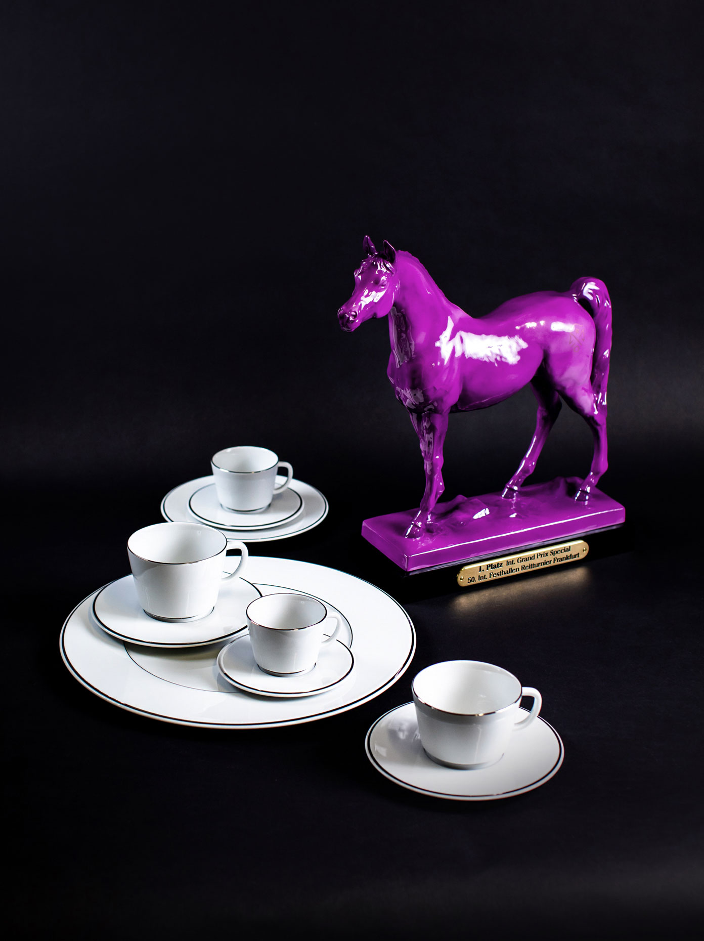Im Laufe der Jahrhunderte sollten zudem weitere hochtalentierte Modelleure in die Fußstapfen von Kirchner und Kaendler treten und das Portfolio von Meissener Porzellan-Figuren um unzählige atemberaubende Tierplastiken erweitern – ob Paul Walther, Erich Oehme oder auch der große Jörg Danielczyk. Nachdem Danielczyk bereits 9 Jahre für die Manufaktur tätig war, wählte der damalige Modellmeister, Peter Strang, ihn aus einer Reihe von Manufakturisten eher zufällig aus, um ein Pferd zu modellieren. Nicht irgendein Pferd, sondern eine echte Berühmheit des Pferdesports: Die Hessenstute Halla, die zusammen mit Hans Günter Winkler mehrmals Gold bei den olympischen Sommerspielen gewann. Danielcyk schaffte es, den Charakter des tierischen Modells vollständig zu durchdringen und wiederzugeben, sodass der begeisterte Peter Strang ihn als Schüler zu sich nahm und aus ihm den großen Modelleur formte, der er bis zu seiner Pensionierung im Jahre 2017 war. Diese Begabung konnte er auch 2013 bei der Erschaffung des edlen Arabers unter Beweis stellen, welcher als Vorbild für die drei lila Ehrenpreise des IFRF dienten.