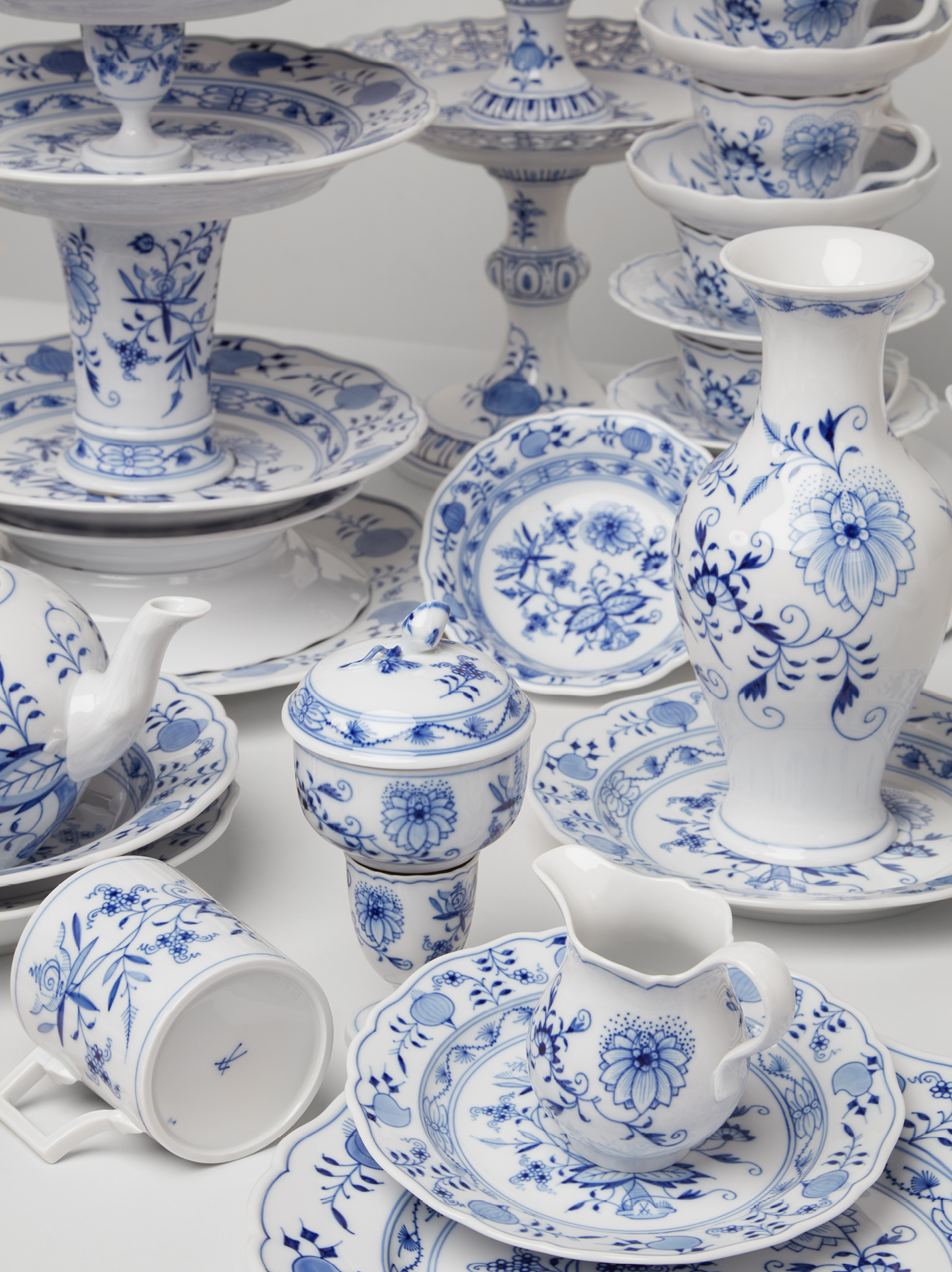 Die Geburtsstunde des europäischen Porzellans schlug im Jahre 1710 mit der Gründung der Meissener Porzellanmanufaktur durch August den Starken, den Kurfürsten von Sachsen. Die Manufaktur war die Erste in Europa, die das Geheimnis der Porzellanherstellung entschlüsseln konnte. Schon wenige Jahre nach der Gründung wurde in Meißen das Zwiebelmuster (ca. 1739) entwickelt. Im Unterschied zu seinen fernöstlichen Vorbildern war das Meissener Zwiebelmuster jedoch keine exakte Kopie. Es war vielmehr eine stilisierte, europäisierte Version der chinesischen Dekore. Der Name „Zwiebelmuster“ ist dabei irreführend, denn die ursprünglich dargestellten Motive zeigten keine Zwiebeln, sondern Pfirsiche, Melone und Bambusstauden, die in den europäischen Augen allerdings wie Zwiebeln wirkten. Die Ausführung der Muster erfolgte klassisch in kobaltblauer Unterglasurmalerei, die bis heute als charakteristisches Merkmal dieses Dekors gilt.