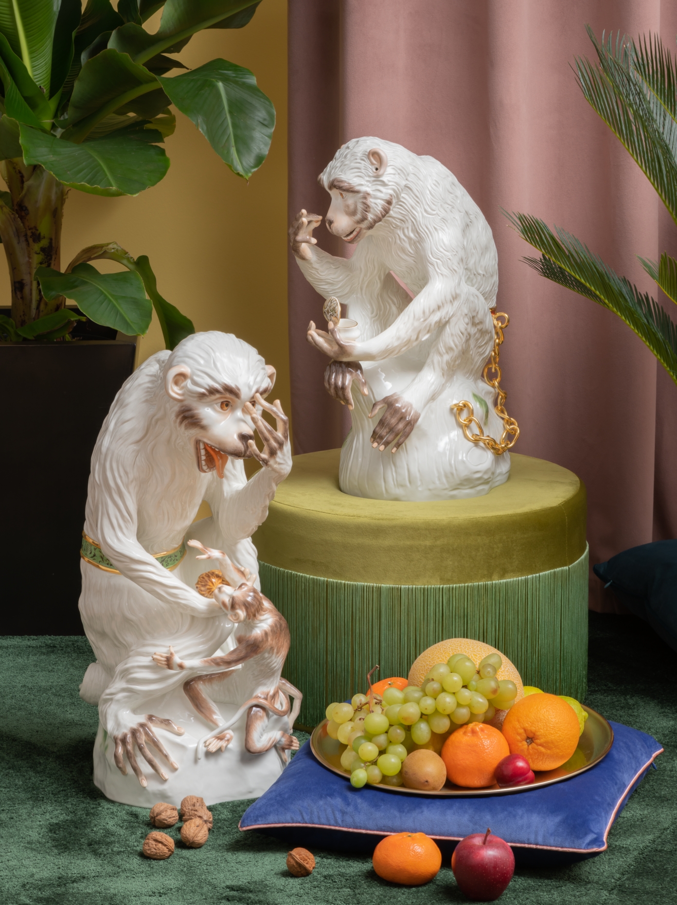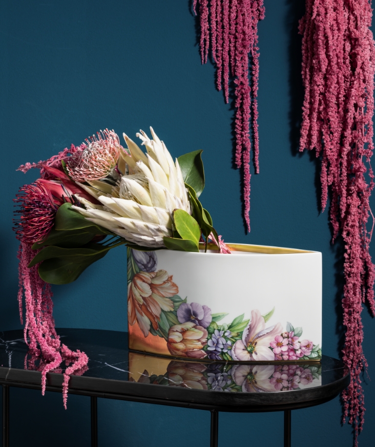 Zusammen mit maritimem Dekor wie die Meeresmotive von „MEISSEN Blue Treasures" entsteht eine sinnliche Nähe zu Strand und Meer. Anders die prächtigen Räume im südost-asiatischen Stil, die durch symmetrische Gestaltung, eine kräftige Farbgebung, farbenfrohe Orchideen und prächtige Porzellanvasen einen Wow-Effekt garantieren. Soll die Reise in die Tropen führen, sind es strahlende Farben, exotische Tier- und Pflanzenmotive und opulente Edelmetall-Akzente, die uns begegnen – Ananasdosen und Blattschalen sowie handbemalte Papageie, Leoparden und Affen, die in Meissener Porzellan gekonnt Ausdruck finden.
