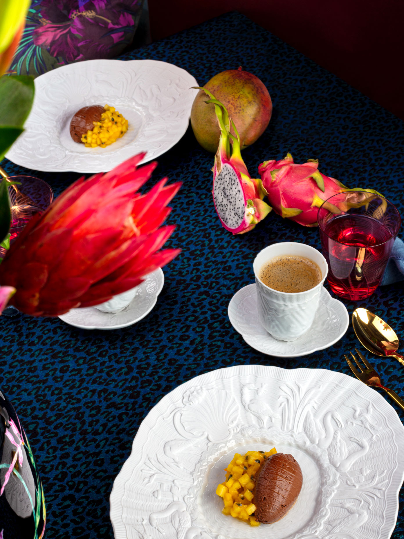 3. Die Mango und Ananas in kleine Stücke schneiden. Mit Passionsfruchtfleisch, Limettensaft und etwas Honig marinieren und mit der Schokoladenmousse servieren.