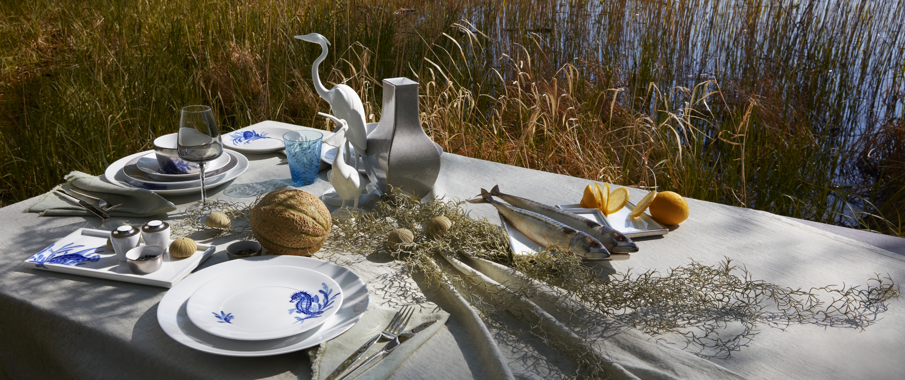 In geübten Pinselstrichen werden die bewegten Motive – Hummer, Seepferdchen, Muscheln und verschiedenste Fische – auf das noch unglasierte Porzellan appliziert und durch mehrfaches Auftragen schattiert und zum Leben erweckt. Korrekturen sind dabei nicht möglich, da die Farbe sofort in den Scherben einzieht. Im zweiten Brand erstrahlt die Malerei unter schützender Glasur dann schließlich im charakteristischen Kobaltblau. Ein gestalterischer Aufwand, der sich nicht nur ästhetisch, sondern auch ganz praktisch lohnt: alle Teile der Kollektion sind dank Unterglasurmalerei spülmaschinenfest, mikrowellengeeignet und bedenkenlos stapelbar – perfekt, um auch im alltäglichen Gebrauch und eigenen Interieur ein maritim sommerliches Ambiente einziehen zu lassen. Ob als kohärente Tafel oder im zutiefst persönlichen Mix & Match Stil.