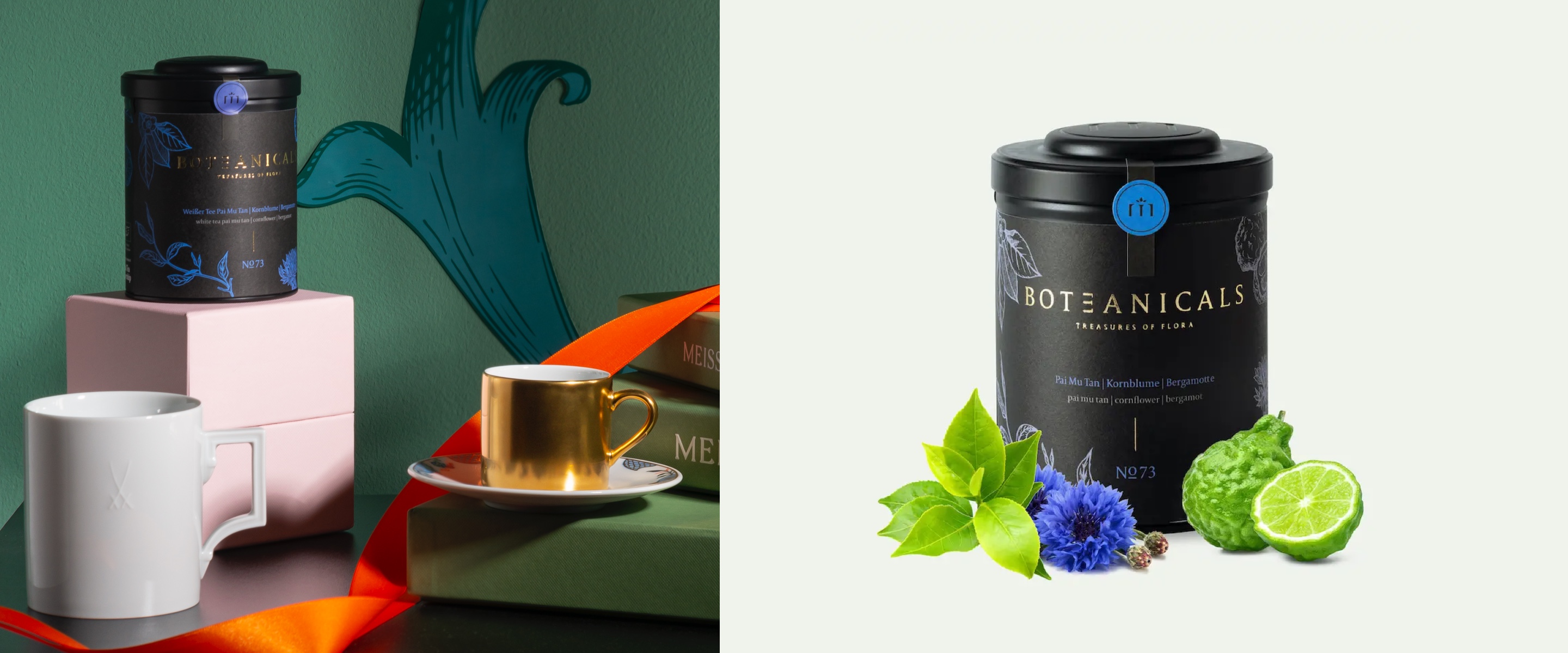 Für das gemeinsame Geschenke-Set mit MEISSEN wurde die Kreation No. 73 ausgewählt, die den edlen Charakter des Weißen Tees Pai Mu Tan aus China mit dem würzig-herben Geschmack chilenischer Kornblumen und dem unverwechselbaren Duft der italienischen Zitrusfrucht Bergamotte zu einem einzigartigen Geschmackserlebnis verbindet. Komplettiert wird das Geschenke-Set durch den zeitlosen MEISSEN Henkelbecher der Form „Berlin“. Mit seinem modernen Design, der Strahlkraft des weißen Porzellans und den weltberühmten gekreuzten Schwertern als Relief, verleiht der Mug dem Teegenuss eine Extraportion an sinnlicher Eleganz. Abgerundet wird das Duo durch seine edle Verpackung, die das Set zum exklusiven Geschenk für alle Teeliebhaber*innen macht.