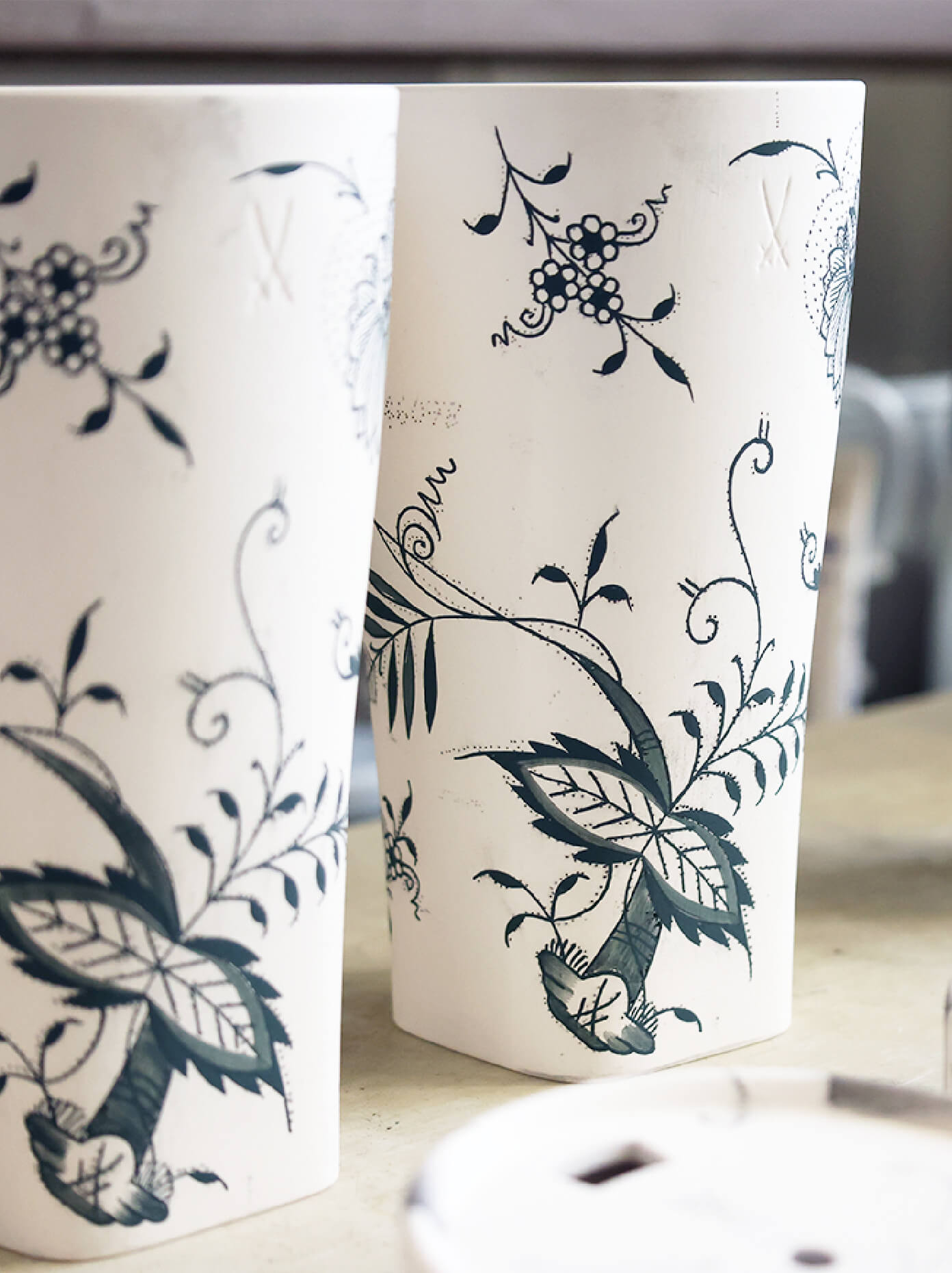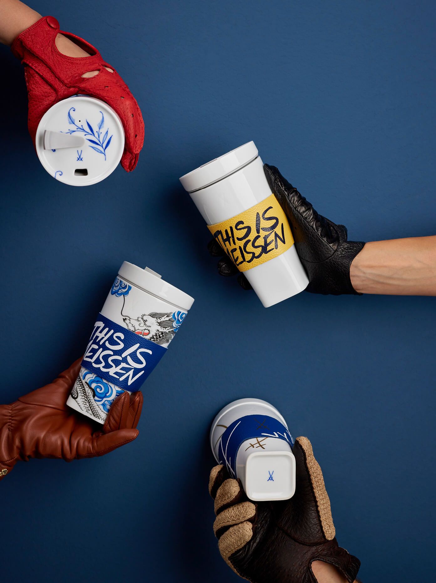 Eines der ersten Dekore, die die Produktdesignerin für den Coffee-to-Go-Becher im Sinn hatte, war das Motiv "Affe & Faultier". Als Inspirationsquelle diente dabei ein bemerkenswertes Stück aus der Geschichte von MEISSEN – eine Vase, auf der die Tiere in blauer Unterglasur dargestellt sind. Die Szene, in der die Tiere an den Bäumen hängen, weckte bei der Produktdesignerin Hou Assoziationen von Erschöpfung, Müdigkeit und dem dringenden Bedürfnis nach Kaffee. Weitere ikonische Dekore, wie das Zwiebelmuster in klassischem Blau oder die Gekreuzten Schwerter in Gold folgten. Anlässlich des bevorstehenden Jahr des Drachens wurde zudem eine Variante mit dem von Hou gestalteten Glücksdrachen vorgesehen.