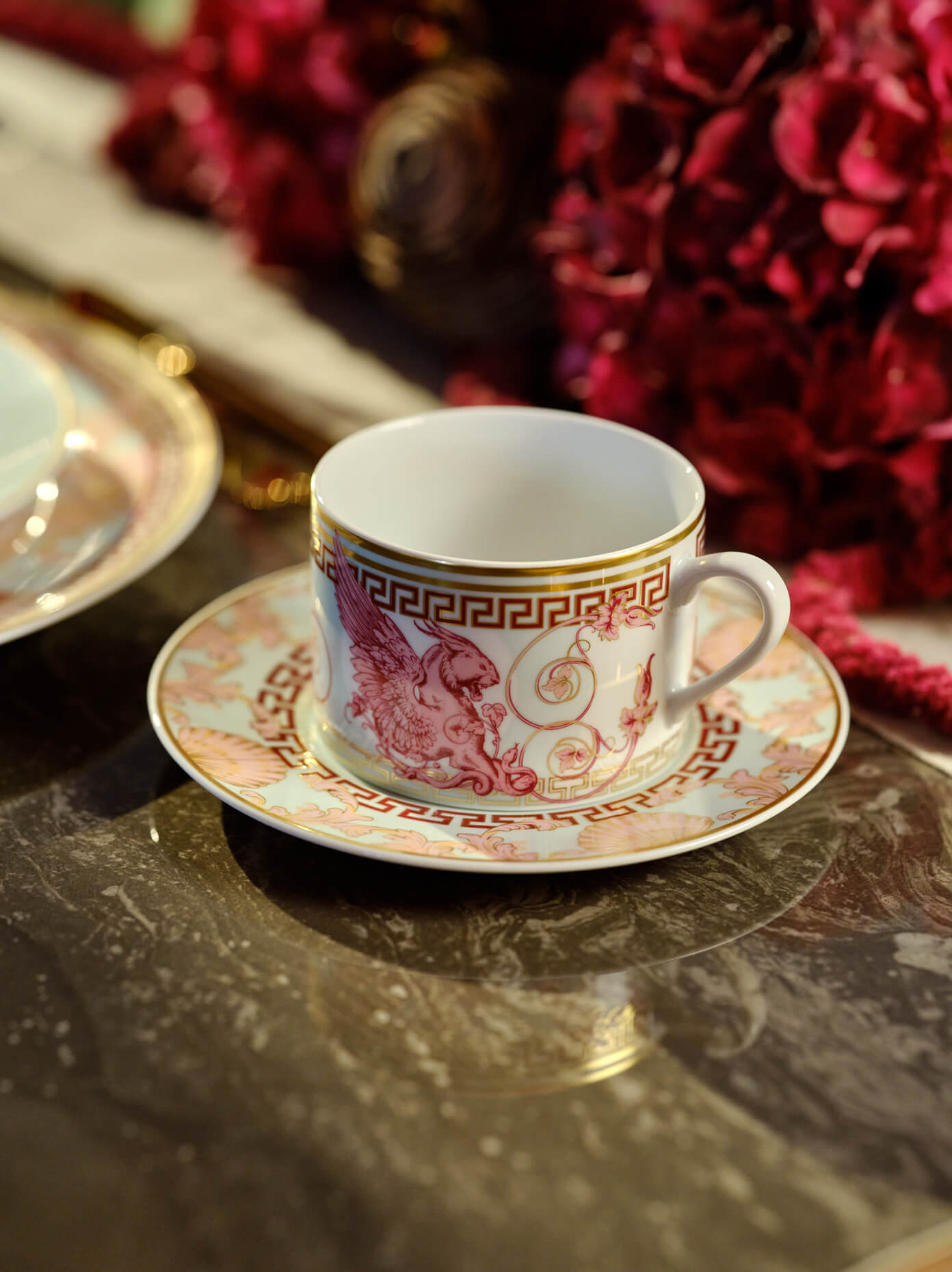 Mit den fantasievollen „Mystic Maison“ Dekoren entfaltet sich auf der eleganten Form N° 41 ein wahres Meisterwerk der Tisch & Tafel Kunst. Harmonisch verschlungene Mäanderbänder und florale Ornamente winden sich in kunstvollen Schwüngen über das Porzellan.