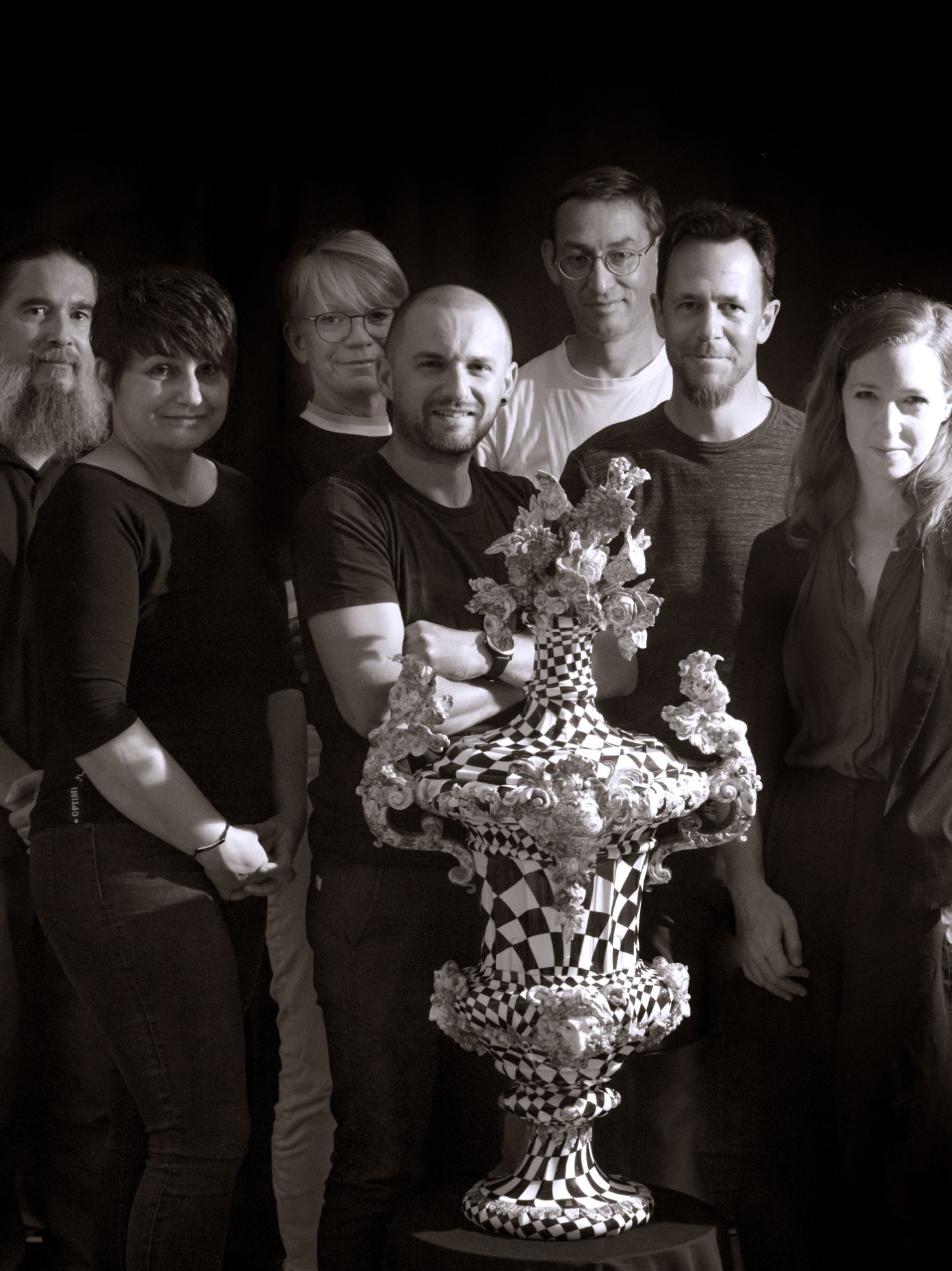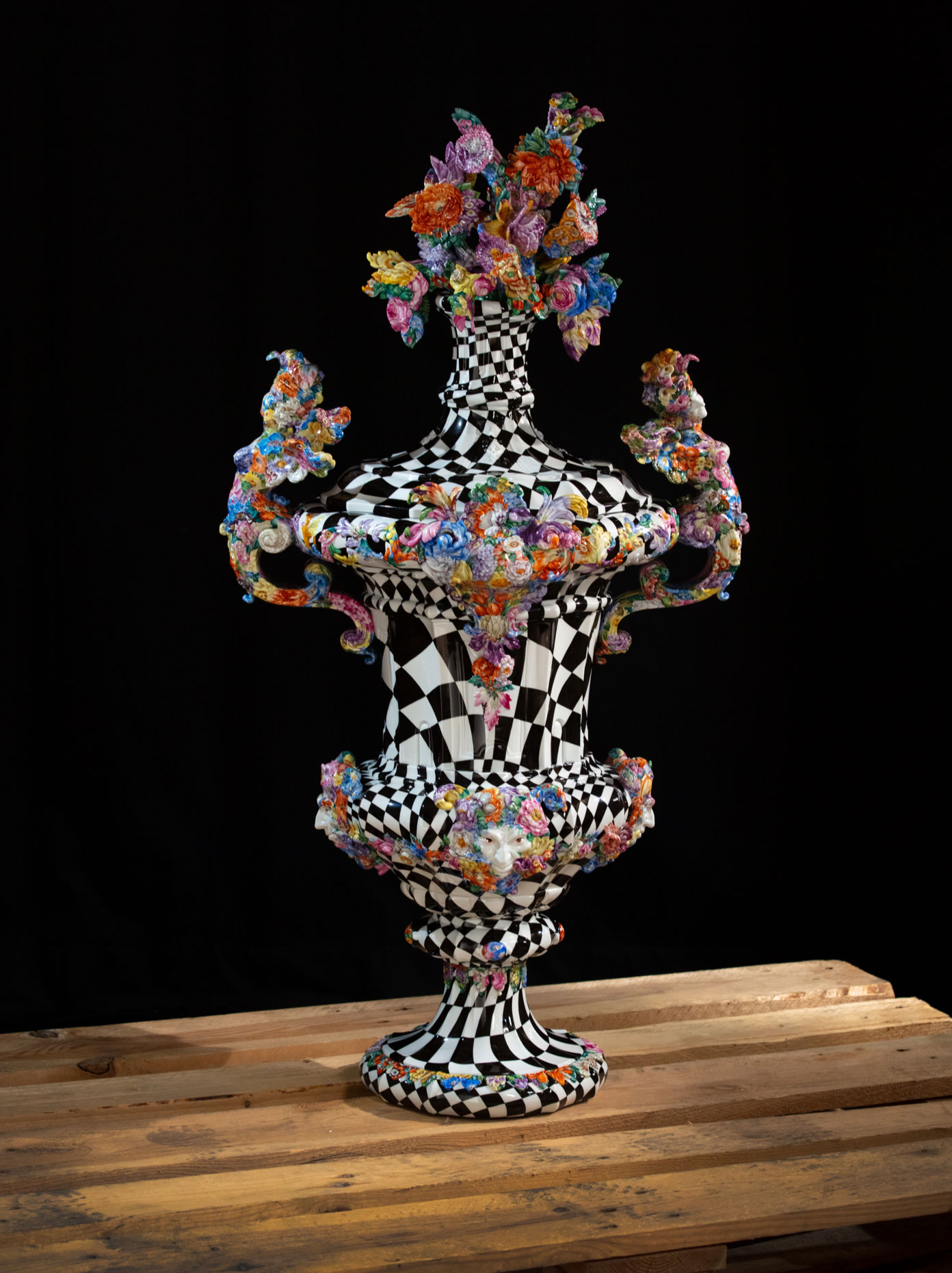 Als wahre Meisterleistung der Bossierkunst beeindruckt die prachtvolle Vasenform nun mit plastischen Blumenranken, weibliche Hermen und Maskarons zieren die Henkel. Der historische Vasenkörper wird durch die dynamische Gestaltung spannungsvoll umschmeichelt. Zwei gegensätzliche Gestaltungsprinzipien stoßen dabei aufeinander: das Schachbrettmotiv und farbenfrohe Blumenranken als leuchtendes Camouflage-Muster. Die Blumen scheinen grenzenlos und ignorieren ganz bewusst die plastischen Reliefs, um einen surrealen sowie lebendigen Ausdruck zu kreieren. Es ist eine hohe Kunst, plastische Elemente so meisterlich zu verhüllen und der Form ganz bewusst nicht zu folgen.
