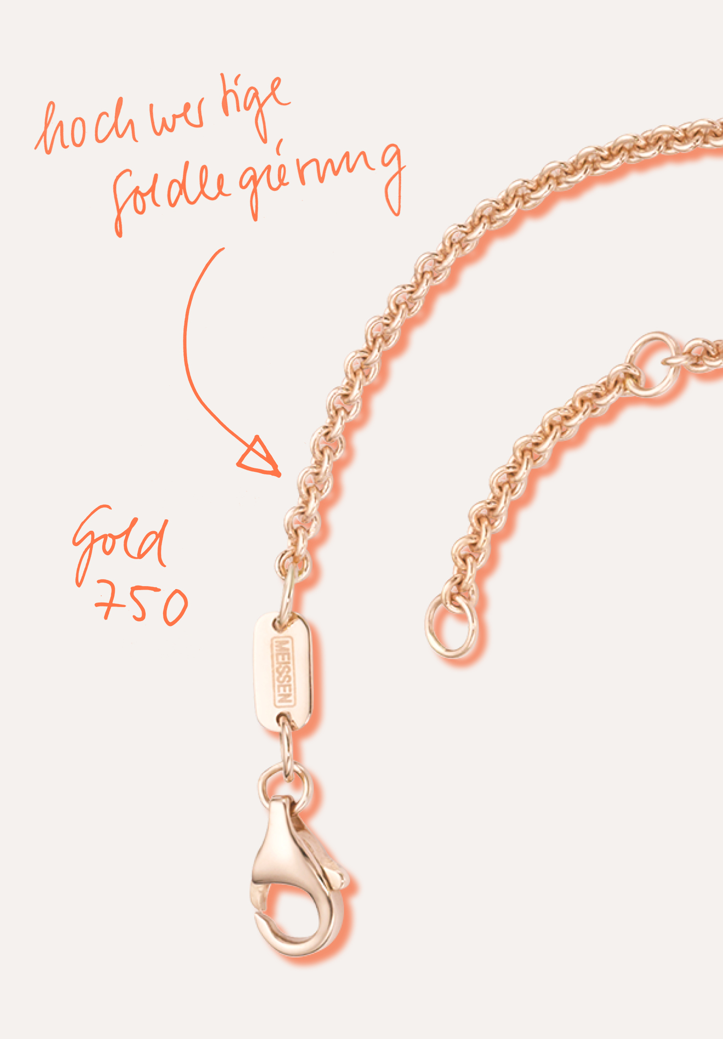 Materialgerechte Handhabung: Für MEISSEN Schmuckstücke aus Gold und Silber werden ausschließlich sehr hochwertige Gold- (Gold 750) sowie höchste Silberlegierungen (Sterling Silber 925) verwendet. Aufgrund ihres hohen Edelmetallanteils sind die Schmuckstücke weicher und anfälliger für Kratzer, können jedoch aufgrund des hochwertigen Materials wieder vollständig aufgearbeitet werden. Um Kratzer zu vermeiden, empfiehlt sich, Schmuckstücke zur Haus- und Gartenarbeit, sowie zum Sport oder auch vor dem Duschen oder der Sauna abzulegen. Denn obgleich MEISSEN Silberschmuck zum Schutz mit Rhodium beschichtet ist, kann Schweiß das Silber zum Anlaufen bringen.