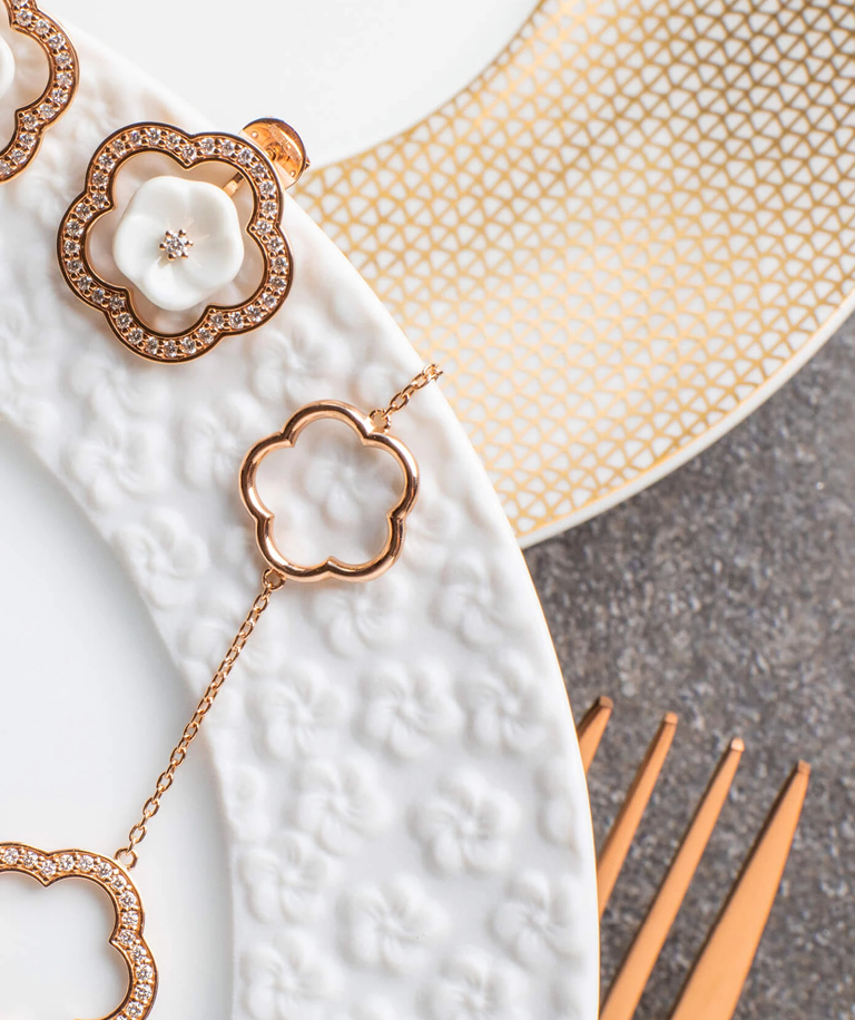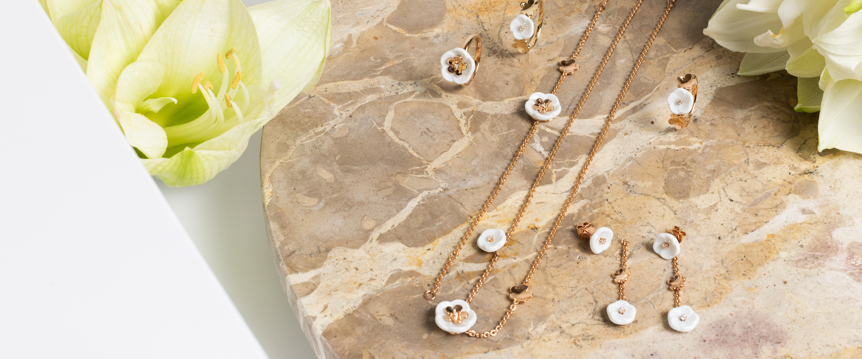 Jeder Symbolschmuck trägt auch eine gewisse Romantik in sich, wie die „1739 Royal Blossom“-Kollektion von MEISSEN beweist. Anmut, Historie und wahre Liebe vereinen sich in dieser Kollektion, wie in keiner anderen. Den Grundstein dafür legte August der III., Sohn von August dem Starken, der seiner geliebten Frau, der Kurfürstin von Österreich, ein unvergessliches Geschenk machen wollte. So erhielt Johann Joachim Kaendler 1739 von ihm den Auftrag, eine zarte Blüte aus weißem Gold zu erschaffen – die Geburtsstunde der Schneeballblüte. Die so filigrane und grazile Anmutung dieser Blüte, wurde in der „1739 Royal Blossom“-Kollektion weiterentwickelt, sodass nun viele verschiedene Varianten zur Auswahl stehen. Ein weiteres Symbol der Liebe mit einer beeindruckenden Geschichte, welche von Ihnen weitererzählt werden kann.