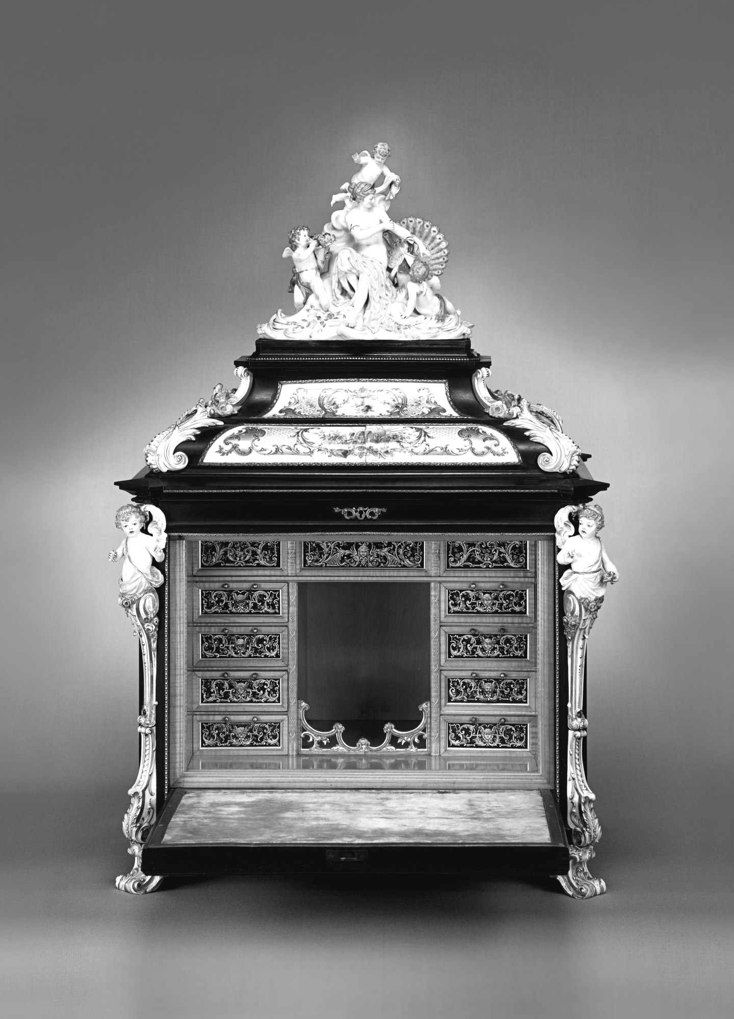 Schmucktruhe1893 wird die „Schmucktruhe“ der Manufaktur Meissen erstmals auf der Weltausstellung in Chicago präsentiert. Nach einem Entwurf von Ludwig Sturm realisiert, verbindet sie historische Techniken der Porzellangestaltung mit edlen Werkstoffen und klassischen Motiven. In Edelholz und Bronze eingefasste Porzellanplatten zu jeder Seite zeigen transluzente Pâte-sur-pâte-Dekore – feinste Schlickermalereien, für die bis zu 30 Schichten flüssige Porzellanmasse mit dem Pinsel aufgetragen und zu einem Relief beschnitten und ziseliert werden. Die aufwendige Technik musste – eigens für die limitierte Neuauflage – von Meissener Porzellanmalern wiedererlernt werden, um die anspruchsvollen antikisierenden Malereien originalgetreu fertigen zu können. Anmutig bekrönende Figur der Truhe ist die römische Göttin Juno, als Sinnbild der Liebe und Schönheit begleitet von ihrem Weihetier dem Pfau. -