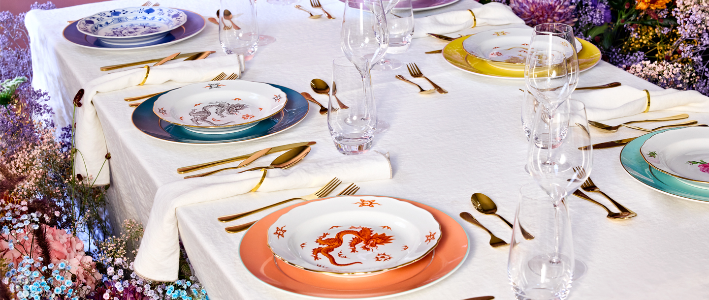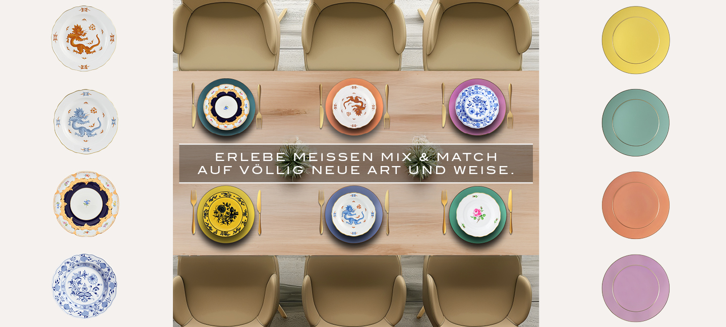 The Perfect MatchLassen Sie sich von unseren persönlichen „Perfect Matches“ inspirieren oder werden Sie zum Designer Ihrer eigenen Festtafel. Kombinieren Sie klassische Dekore wie das ikonische Zwiebelmuster doch beispielsweise einmal mit den Urban Colors-Tellern in der Farbe Rosa und erhalten Sie so einen frischen, jugendlichen Look. Die Drachen von MEISSEN, ob der reiche Drache oder der weltberühmte Ming-Drache, erschienen einst in allen verschiedenen Farben auf „Weißem Gold“ – so lässt sich das Tafelservice bedenkenlos mit allen zugehörigen Farben der Urban Colors-Serie aus der „The Original“ Kollektion verbinden. Und die Meissener Rose? Im Mix & Match mit den seladongrünen Tellern erzeugt diese eine einzigartige romantische Stimmung – das „Perfect Match“ am Esstisch für Ihr „Perfect Match“ am Esstisch.