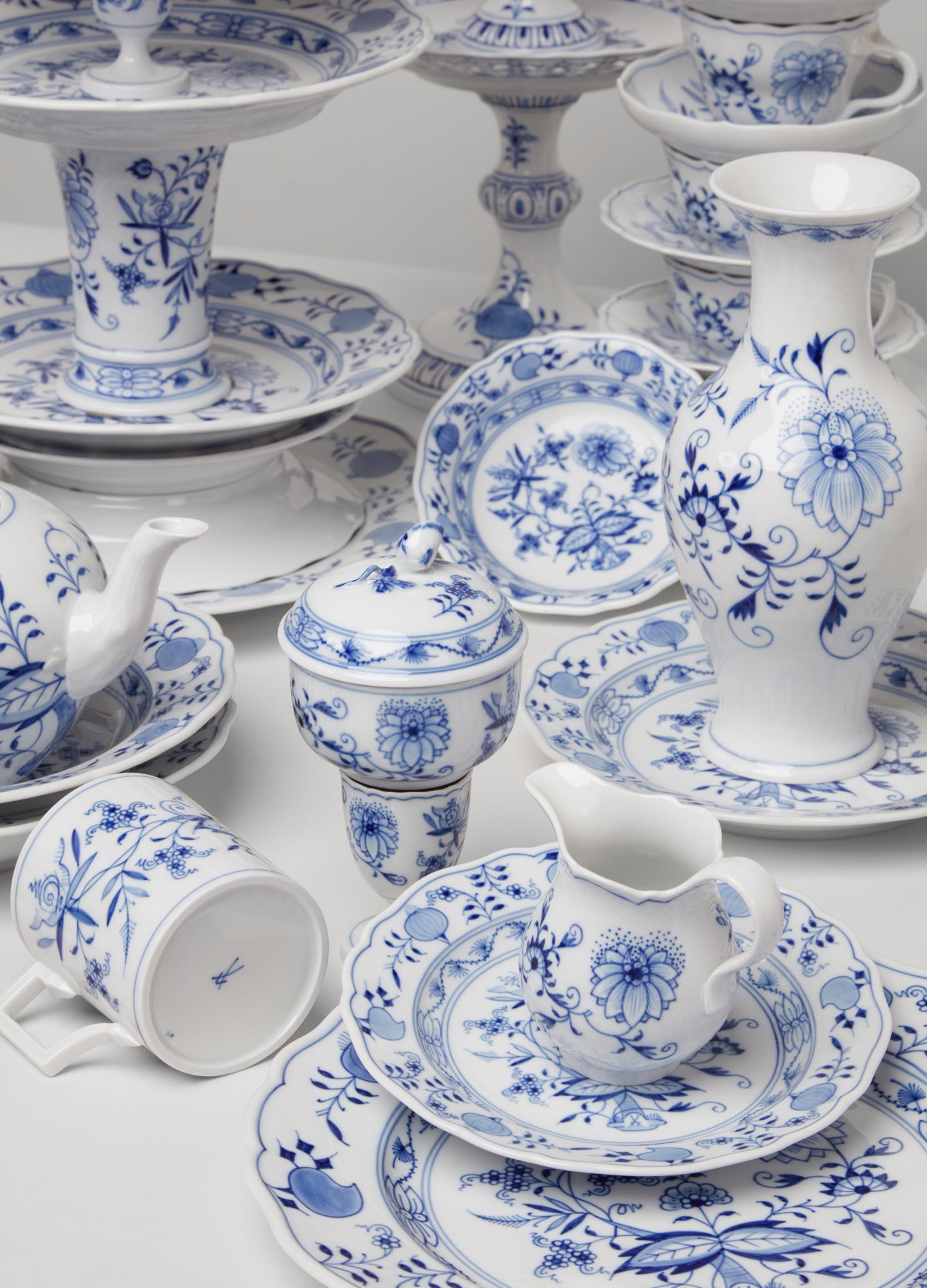 Zwiebelmuster StyleIm Jahr 2004 erfährt das historische "Zwiebelmuster" eine zeitgemäße Überarbeitung. Anstatt der gleichmäßig vollflächigen Bemalung wird die Chrysanthemenblüte asymmetrisch auf dem Tellerspiegel angeordnet. Der Bambusstamm mit Ranken, zarten Blüten und Blättern sowie das Doppelblatt vom klassischen Dekor sind geblieben. Hingegen sind die Früchte vom Tellerrand verschwunden. Der Dekor erscheint aufgelockert und das strahlende Weiß des Porzellans wird stärker betont. Auch auf der Tasse finden sich die Chrysantheme und der Bambusstamm als eine reduzierte, weniger kompakte Bemalung wieder – Umgeben von zarten Ranken scheint der Bambus nahezu aus dieser herauszuwachsen. Die Früchte sind auch hier verschwunden. Nur eine Zwiebel auf der Untertasse erinnert noch an ihre Vorgänger.