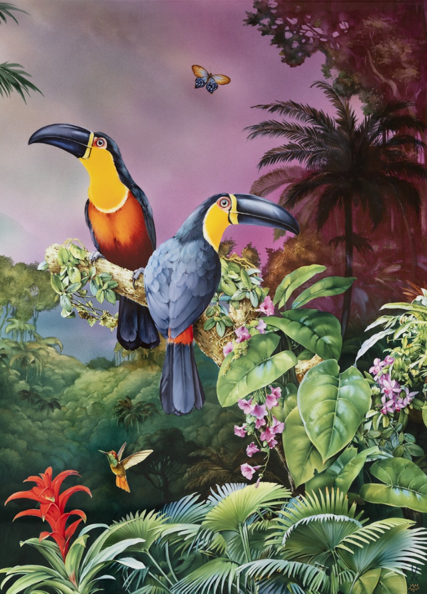 The impressive murals in our “Exclusive Collection” are an artistic journey into the deep green of the rainforest. MEISSEN designer Lena Hensel combined fascinating motifs from the Brazilian Amazon to create a true masterpiece. In her search, she came across the hyacinth macaw, one of the most iconic symbols of Brazilian biodiversity. Using intense colors, she created the tropical habitat of this fascinating bird in a naturalistic painting style and with various, very elaborate painting techniques. Two large specimens of the hyacinth macaw dominate the scene amidst the countless shades of green of the rainforest, framed by lush palm trees and all kinds of other exotic plants. These intelligent and extremely sociable animals have an impressive ability: they can learn to imitate sounds such as the human voice or the sounds of other animals.