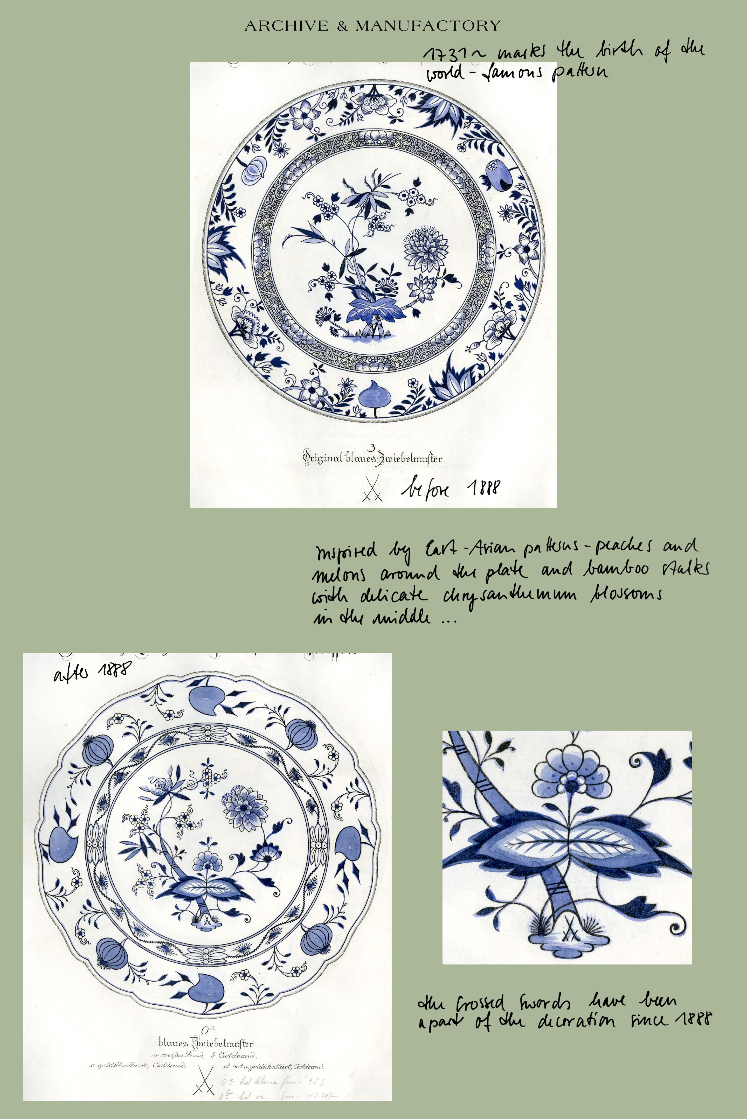 Onion PatternIt is the most successful blue painted pattern in the history of porcelain: in 1739, the radiant blue “Onion Pattern” was developed based on East Asian influences. True to original, the “onions” in the pattern are not in fact onions, but rather peaches and melons on the rim of the plate, and bamboo stalks and delicate chrysanthemum blossoms adorning the centre. In lieu of exotic fruits and flowers to use as templates for their creations, Meissen’s 18th-century artisans’ stylized renditions soon gave rise to their misconception as onions. To this day, Meissen’s “Onion Pattern” is applied to the porcelain by specially trained under-glaze painters. The manufactory’s own cobalt blue is the only paint used for the creation of all Meissen blue porcelain, just as it was 300 years ago. The different shades of blue are all realised with a single colour of paint. -