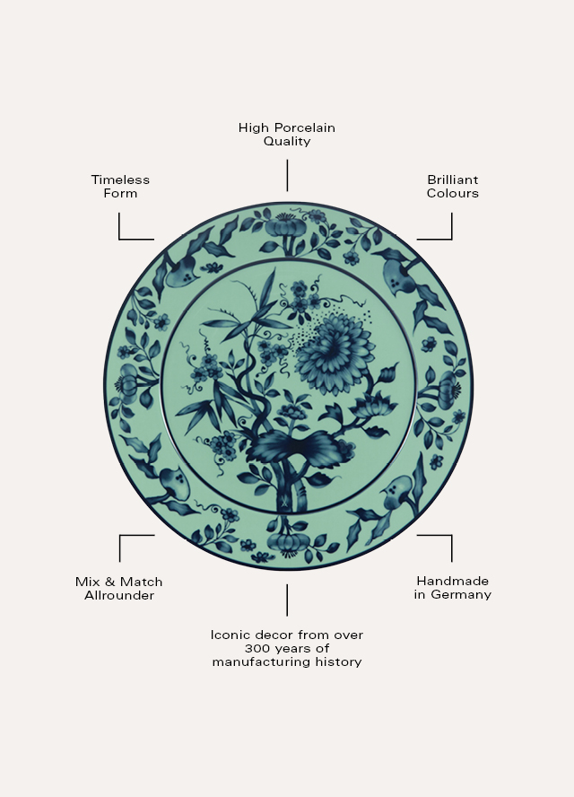 Tradition and modernity - MEISSEN combines traditional craftsmanship and contemporary design in an unprecedented way. For the new collection “The Original”, the MEISSEN porcelain manufactory draws on the valuable treasure of its over 300-year history to create a unique service for the modern table. The origins of the decor can be traced back to the first half of the 18th century. Around 1730, the first variations of the world-famous blue onion pattern were created on European hard porcelain in the MEISSEN porcelain manufactory. Inspired by motifs on Chinese porcelain and faience, the MEISSEN blue painters developed the iconic cobalt blue MEISSEN blue onion, which became the manufactory's best-known underglaze painting. The decoration was given the name “blue onion” due to the melon, which was unknown in 18th century Europe and was mistaken for an onion and, in combination with the peach, still adorns the plate flag today. Before the decoration known today as the classic blue onion pattern became established, there were several variations at the same time.