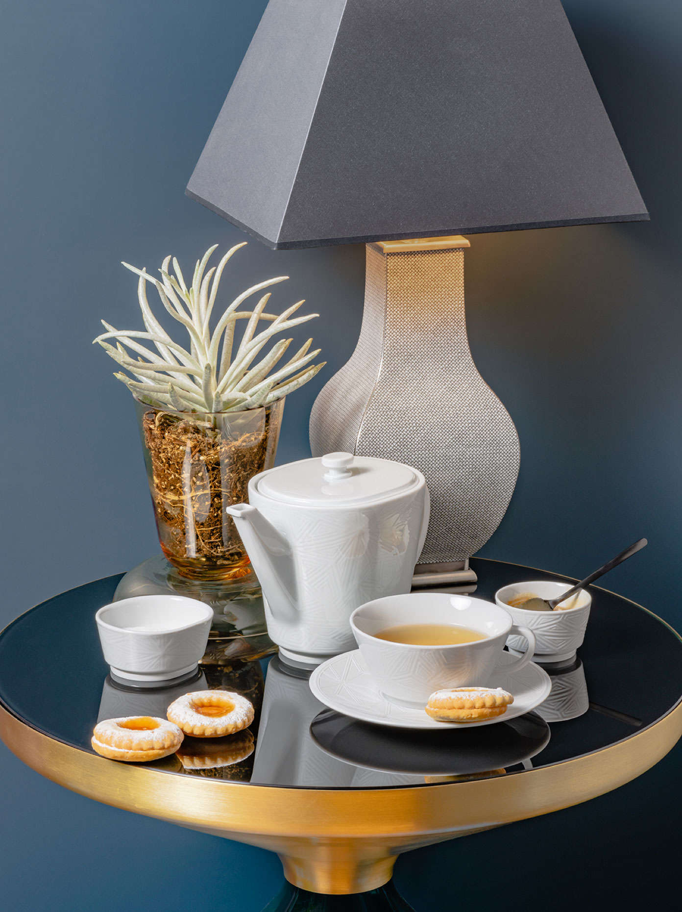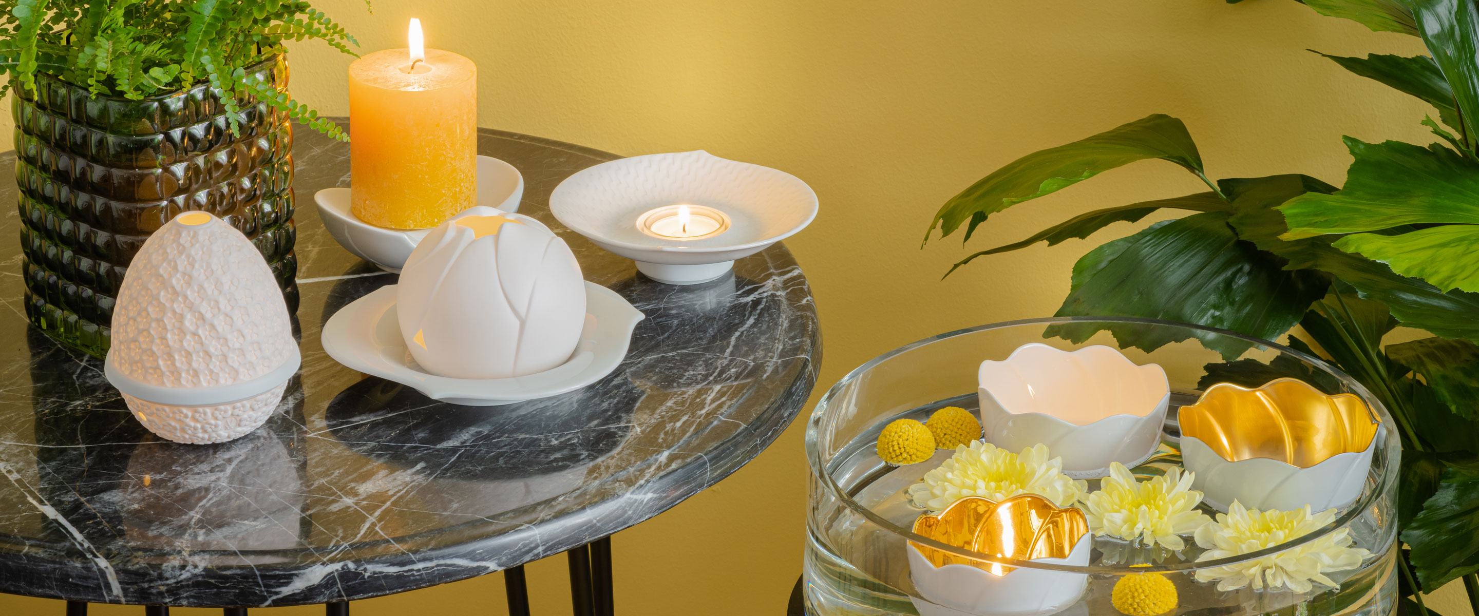 Especially in the autumnal evenings, soft lights can wrap us in an aura of warmth and security. So you can create a small sea of lights with discreet light sources on the tables and shelves, which will bathe your room in a cozy ambience. So turn off the festive lighting and use our table lamp from the "MEISSEN® Cosmopolitan" series, for example. With its clear lines and decorative sweeps, this table lamp is inspired by the design language of modern hotels and thus exudes a high degree of elegance. But even with small lights, such as with the "Royal Blossom“ table light or the dish with tealight from the "Wave Play Relief" collection, you can create a magical atmosphere that will draw you into the spell of autumn.