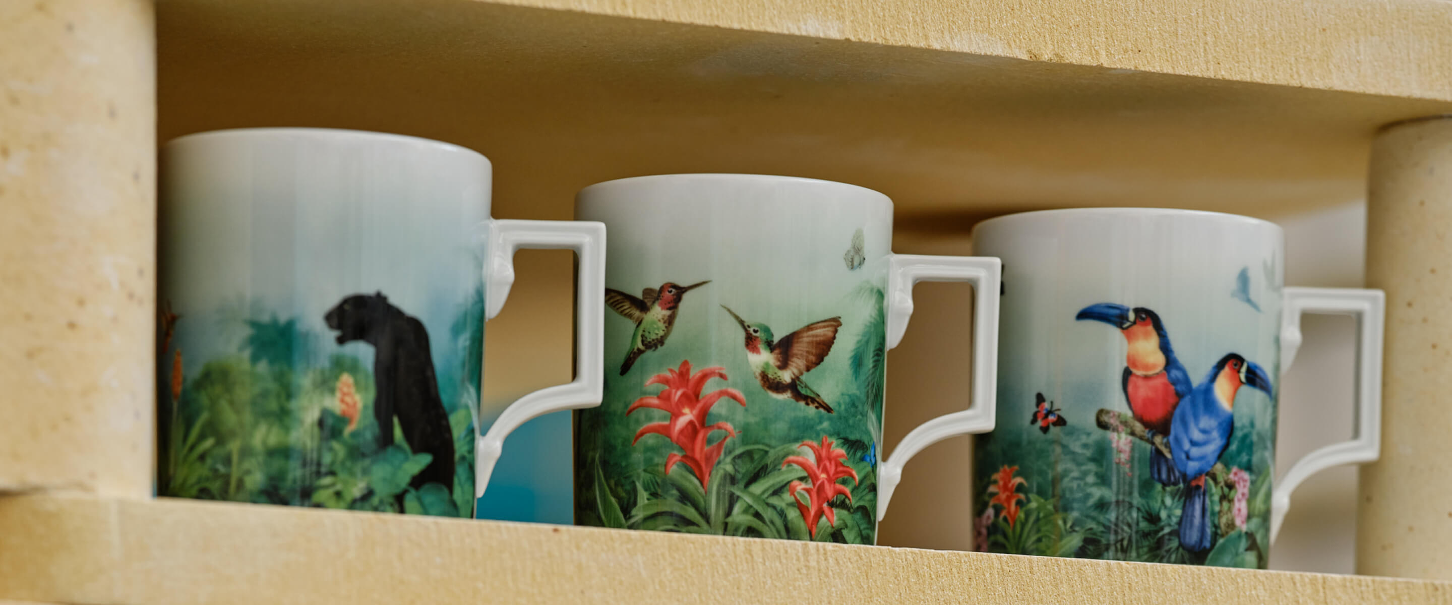 The popular “The MEISSEN Mug Collection” has been expanded to include five unique mugs with the motifs of the murals and the “Amazonas” vase. One of the motifs, the black panther, was painted exclusively for this mug collection. This inhabitant of the rainforest is actually a jaguar with black fur throughout - although the term also applies to leopards with this characteristic. The predator blends majestically into the scenery.