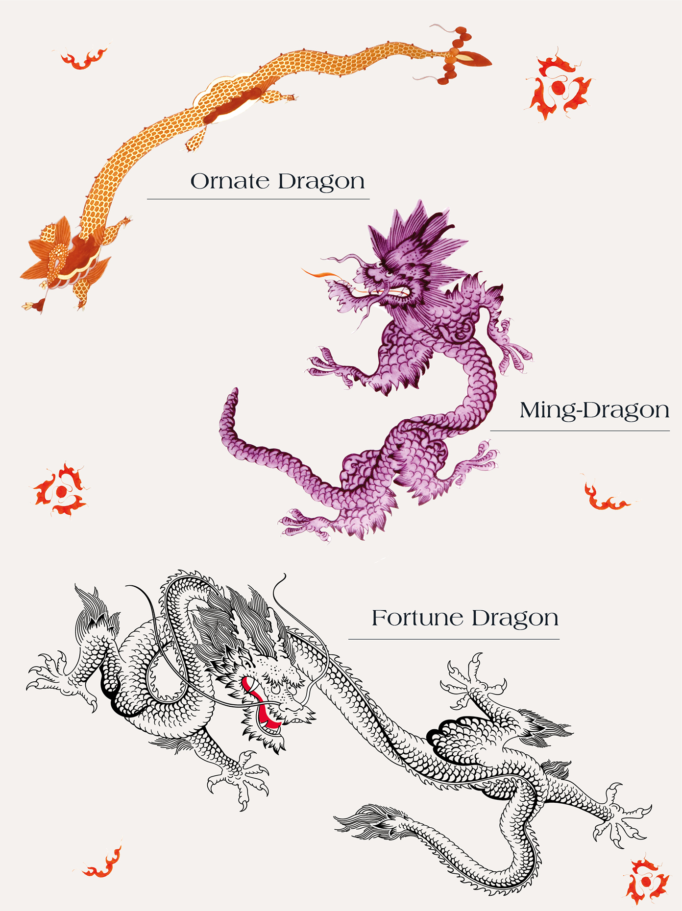 In contrast to the Ornate Dragon, there were no concrete models to guide the development of the Ming Dragon pattern. Instead, they had to rely on lore without knowing the deep symbolism behind the small details. To remedy this and honor the culture behind the dragon, our product designer Zhuoyu Hou, whose roots can be traced back to a small village in southern China, dedicated herself to designing a real (imperial) dragon. This is how the new "Fortune Dragon" was created in 2022, which differs considerably from its predecessor - for example, with a tongue that does not stick out, a tail end with hair and, above all, limbs with five claws.