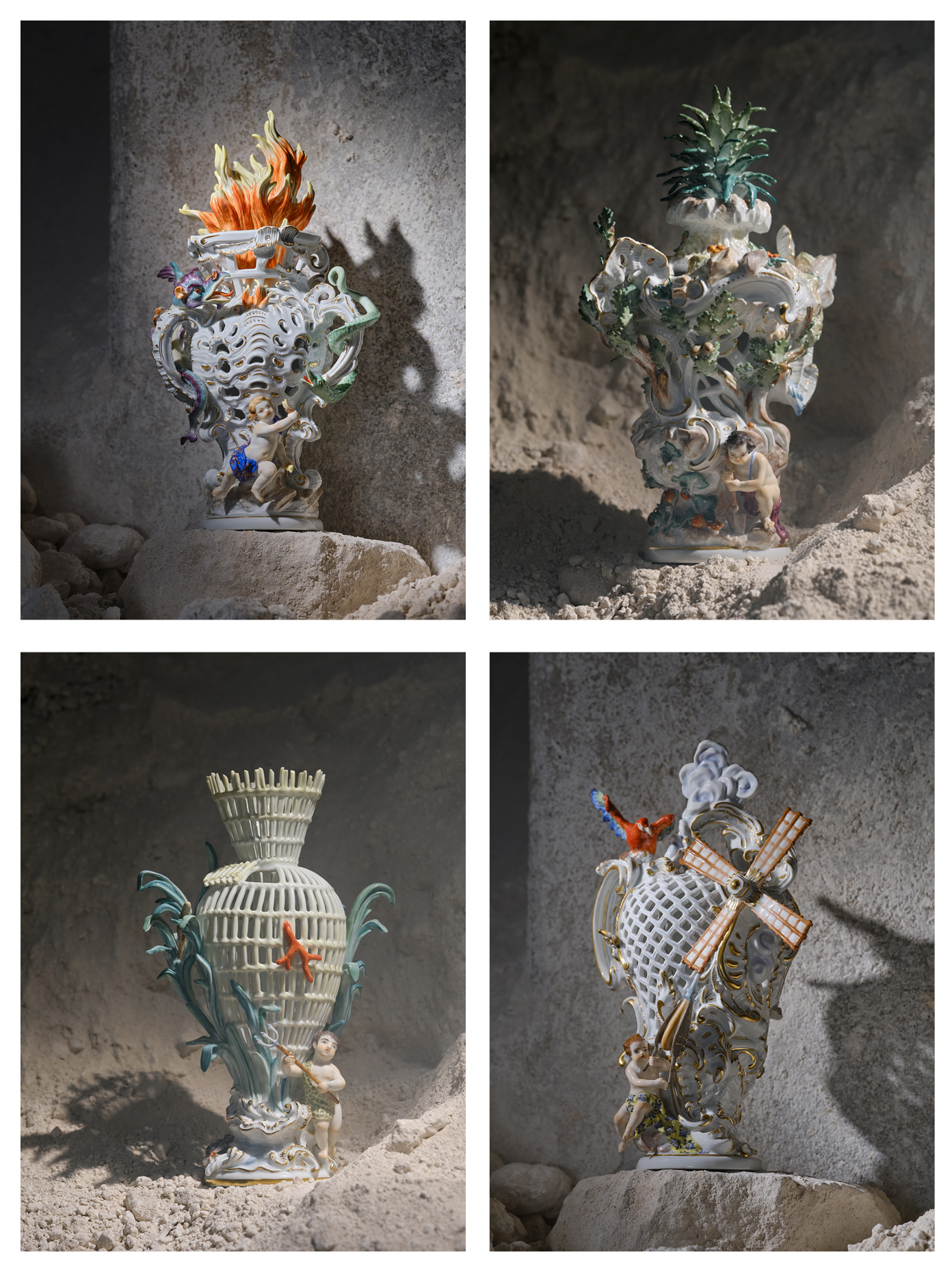 For the new edition of the “small” element vases, however, the MEISSEN craftsmen were confronted with several artisanal challenges. For the “Air” vase, for example, 60 individual shapes had to be assembled, the windmill wheel adjusted and the bellows fitted precisely. The “Water” vase consists of 54 individual shapes and fitting and attaching the filigree, net-like cage in particular requires a great deal of dexterity. The “Earth” vase, which consists of 32 individual shapes, stands out due to the agave on the neck of the bottle, which has numerous individual leaves that have to be modeled, joined together and finally decorated. The “Fire” vase even has 85 individual shapes. What all four vases have in common is the technical difficulty in approaching the breakthrough - when is the right time to cut it out, when do kites or other decorations need to be attached? But all the effort was worth it and a work of European porcelain art with a long history could be recreated.