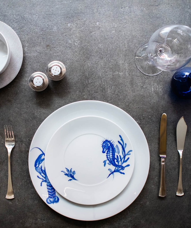 The moving motifs - lobsters, seahorses, shells and a wide variety of fish - are applied to the still unglazed porcelain in precise brushstrokes, shaded and brought to life by multiple applications. Corrections are not possible, as the colour is immediately absorbed into the body. In the second firing, the painting finally shines in the characteristic cobalt blue under a protective glaze. A creative effort that pays off not only aesthetically but also practically: thanks to the underglaze painting, all the pieces in the collection are dishwasher-safe, microwaveable and can be stacked without hesitation - perfect for creating a maritime summer ambience in everyday use and in your own interior. Whether as a coherent table or in a deeply personal mix & match style.