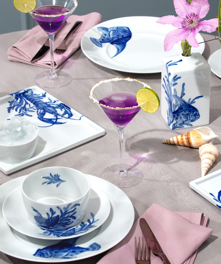 “As if guided by gentle waves and a sea breeze, the flowing brushstrokes of the maritime decors capture a fascinating underwater world on plates, vases and vessels in luminous blue painting and allow a maritime summer ambience to take hold in one's own interior.”