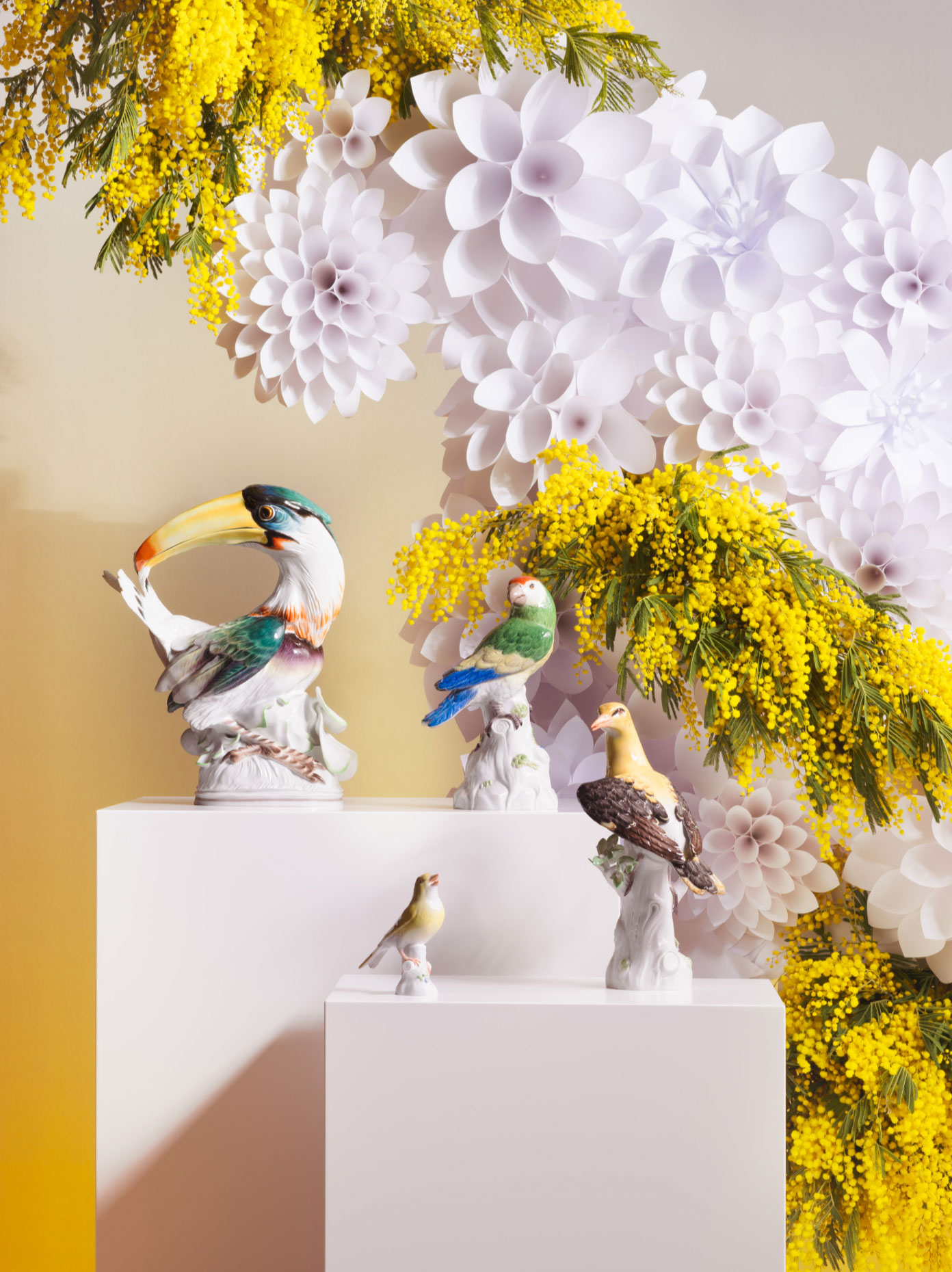 One of the most popular themes of MEISSEN porcelain modelers is and always has been the world of birds. The modelers were not only inspired by local birds. For example, with the parrot, the canary or many other representatives of the avifauna, Kaendler had made a variety of exotic bird species in lifelike, detailed representations, which also come from the exotic bird world. But other modelers have also made a name for themselves with impressive works. For example, Paul Walther (who worked for MEISSEN from 1904 to 1933) is considered one of the most productive modelers with his 196 models created. His works include the noble heron or the toucan. And also the well-known sculptor Jörg Danielcyzk (active for MEISSEN from 1969 to 2018) created true masterpieces in bird form, such as the impressive bald eagle, among others.
