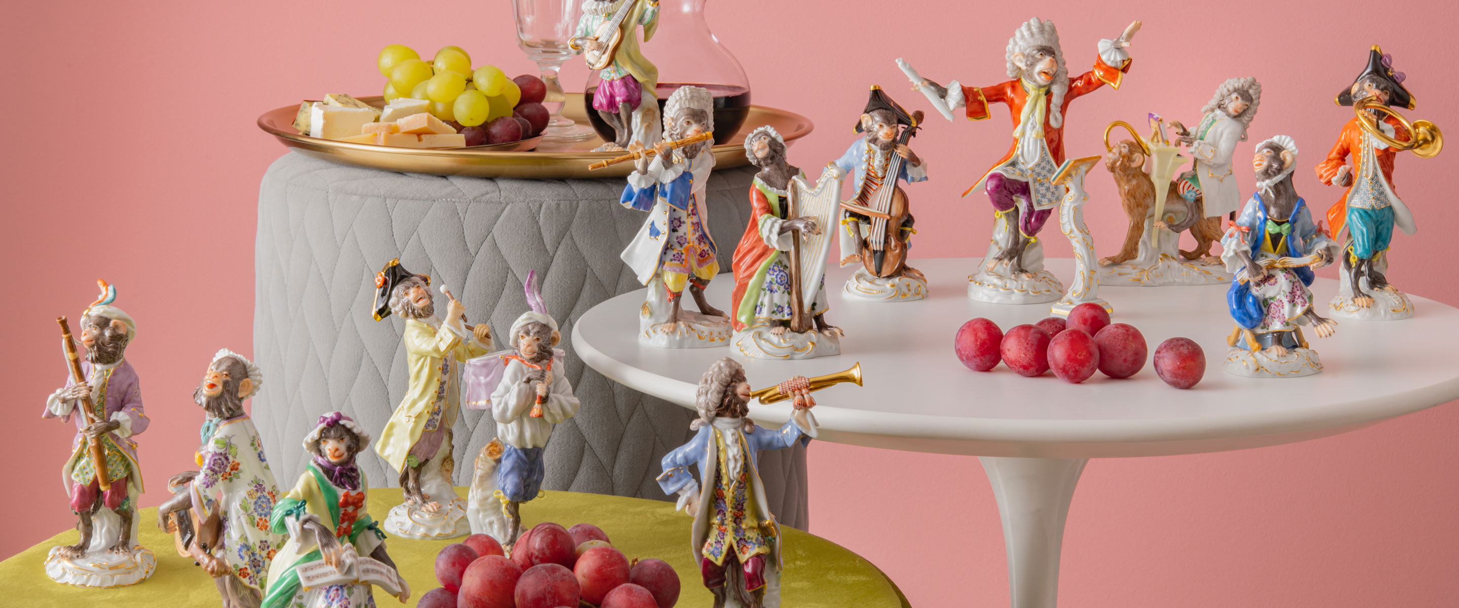 Probably the most popular ensemble of figurines is the Monkey Orchestra developed by Kaendler. But also the pug he modeled is a real celebrity in the porcelain menagerie of MEISSEN, which today is available in many different variations as a pug figurine or pug pendant. He is a symbol of loyalty and was originally commissioned as a gift from Augustus the Strong for his mistress Anna Constantina, Imperial Countess of Cosel, as a token of love.