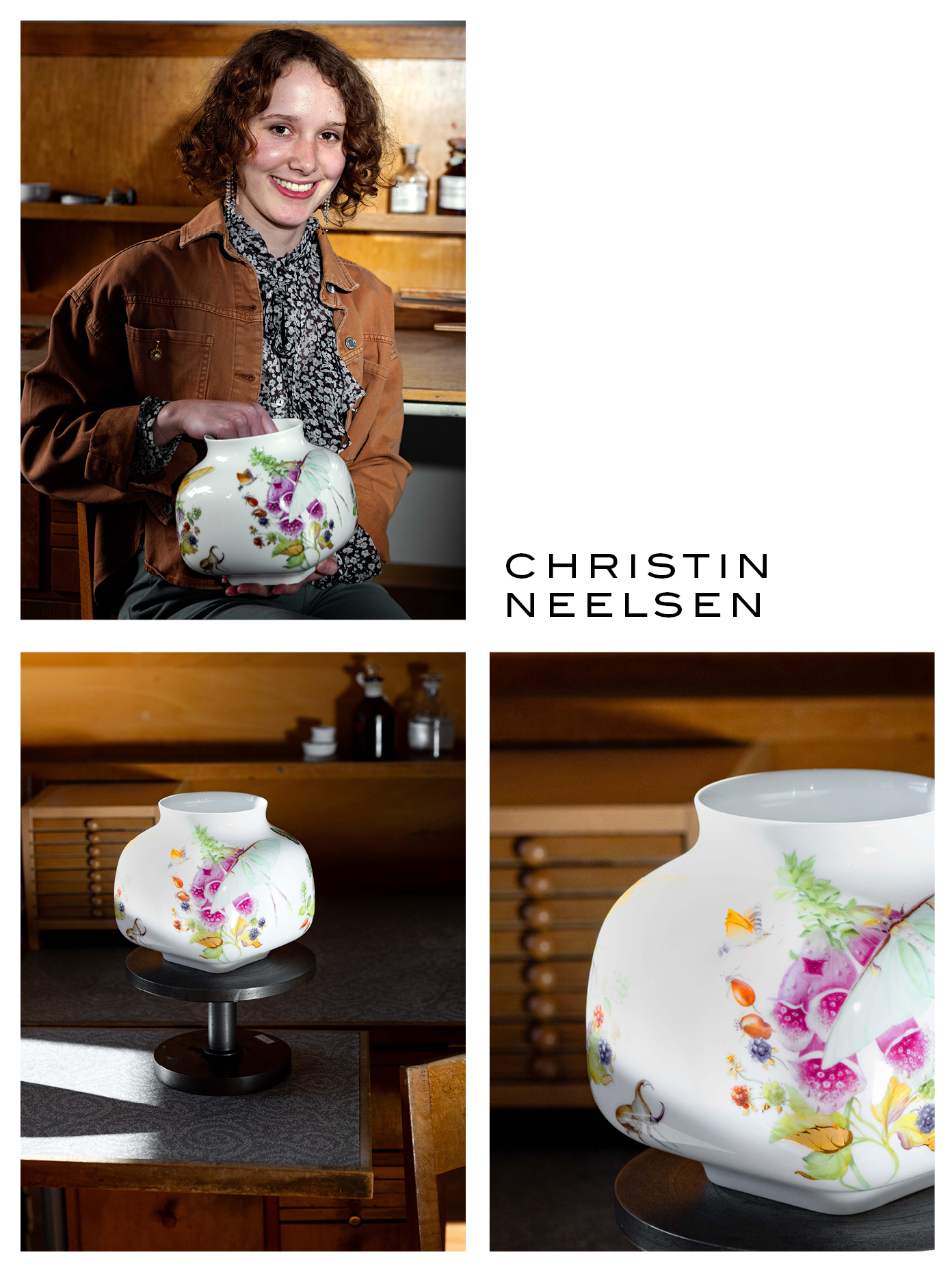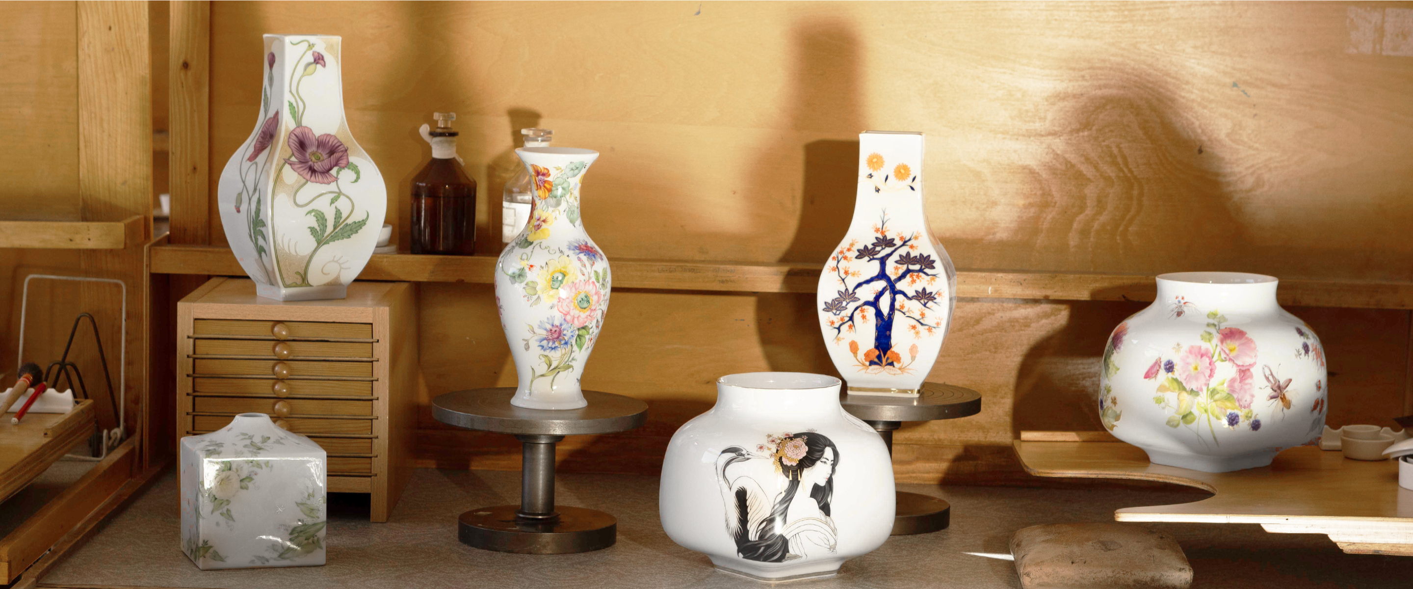 During her apprenticeship, she tried out various techniques, developed her own patterns, completed production assignments, and worked intensively with materials, perspective, and the effects of color. She was particularly fascinated by lifelike, plastic painting with watercolors and by transferring drawings onto porcelain.
