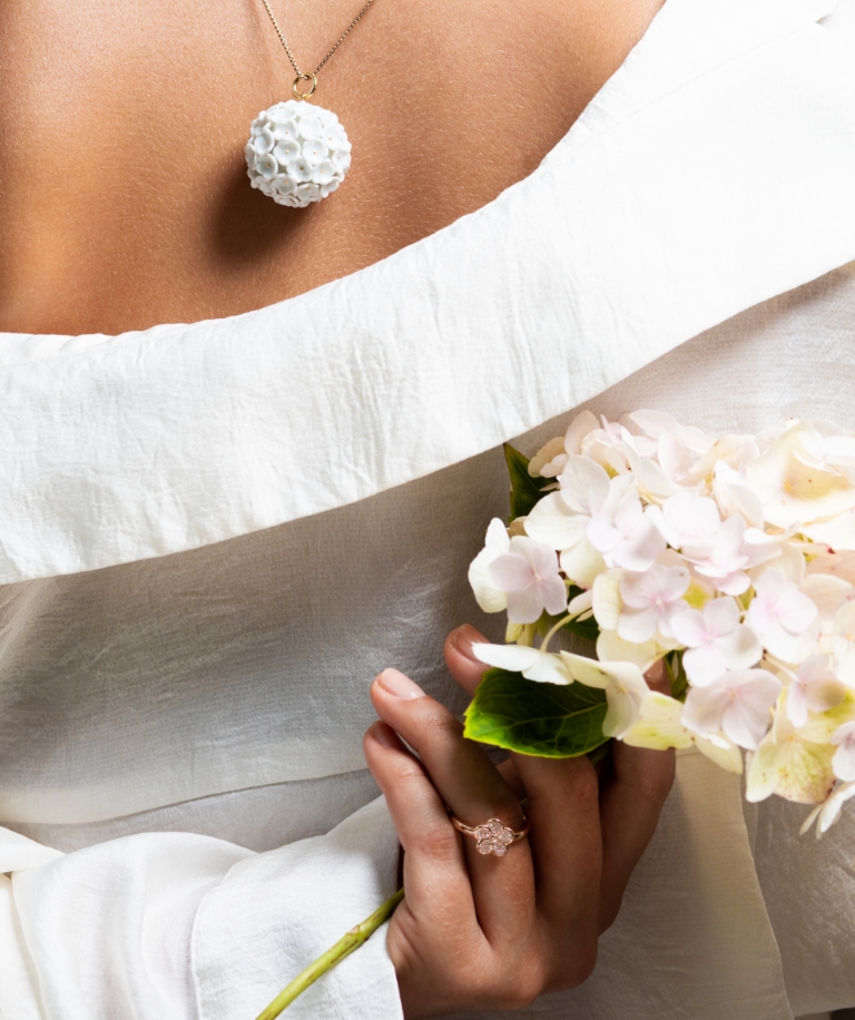 Rings are among the oldest pieces of jewellery in the world and are not only a symbol of love and connection. They can also symbolise faith, wealth, power or one's own ideals. The decisive factors are both the material and the design, which give each ring its specific meaning. Whether a friendship ring, signet ring, wedding ring, christening ring or family ring - each ring stands for its very own promise. But probably the most romantic promise is symbolised by the engagement ring - it stands for eternal love, affection and appreciation. The ring itself was already forged in antiquity from a single cast in the shape of a circle - without beginning or end - and was thus a sign of close union. The rite of putting the ring on the ring finger of the left hand also dates from this time. According to belief, this finger is directly connected to the heart through a vein. Moreover, the left side of the body is considered the heart side - where all feelings find their place. With this romantic message, it is especially the engagement or wedding ring that finds its place on this finger. Our "1739 Royal Blossom" jewellery collection was once a promise of eternal love and has its origins in what is probably the most famous love story of the porcelain manufactory. Created in 1739 by Johann Joachim Kaendler, the original Snowball Blossoms once adorned the magnificent service commissioned by King August III as a gift for his beloved wife Maria Josepha. Almost 300 years later, the symbol of this romantic gesture - the iconic porcelain blossom - is transformed into unique pieces of jewellery in our manufactory. But before the delicate Snowball Blossom adorns the golden ring, it passes through many hands. The blossom is shaped by hand with great appreciation for the material, marked with the blue swords, fired, glazed and crowned with a diamond flower stamp. This makes each piece of jewellery a small unique piece - which can be the beginning of your very personal love story.