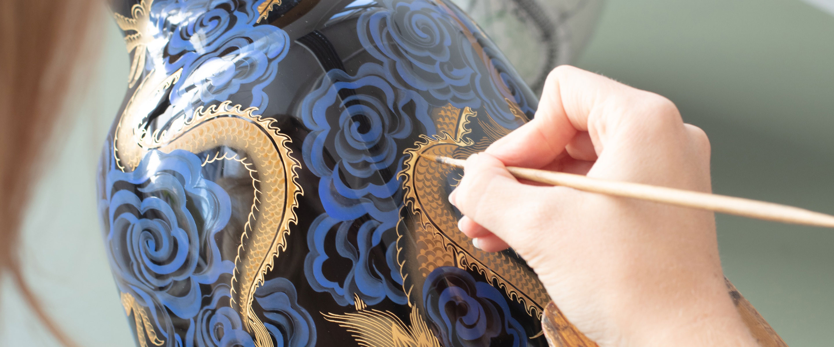 • Connected inseparably with all depictions of dragons is the image of the so-called “dragon pearl“. It is considered to be the source of power and immortality. Accordingly, we also meet her on the “Nova Vase“: Two golden Fortune Dragons are romping in the clouds, surrounding the flaming sphere. The clouds are applied with the so-called “Limoges painting“. Layer by layer, the paint is applied to the black vase body. Depending on the number of layers, parts of the painting appear almost transparent, giving them a special spacial depth. MEISSEN is the only manufactory in the world that still practices the art of Limoges painting today!