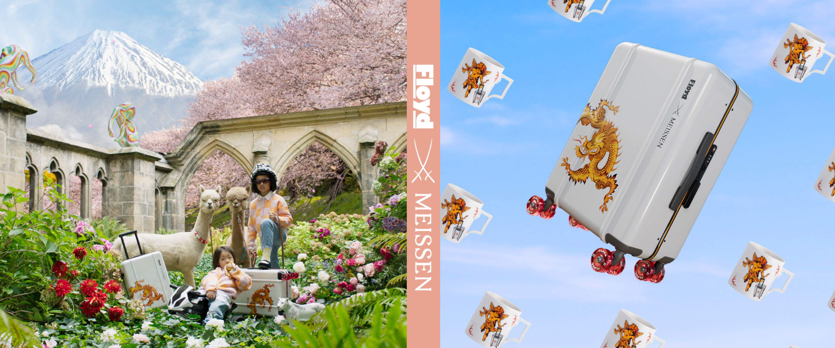 The result is a Floyd x Meissen Travel Case on Wheels, decorated with the world-famous MEISSEN Ming dragon, one of MEISSEN's most famous and oldest designs. In addition, there is a matching porcelain mug with the trademarks of both brands. It is adorned with a chubby-cheeked baroque angel in putto style who travels with a Floyd x MEISSEN case and accompanies you on your trips as your very own personal guardian angel.