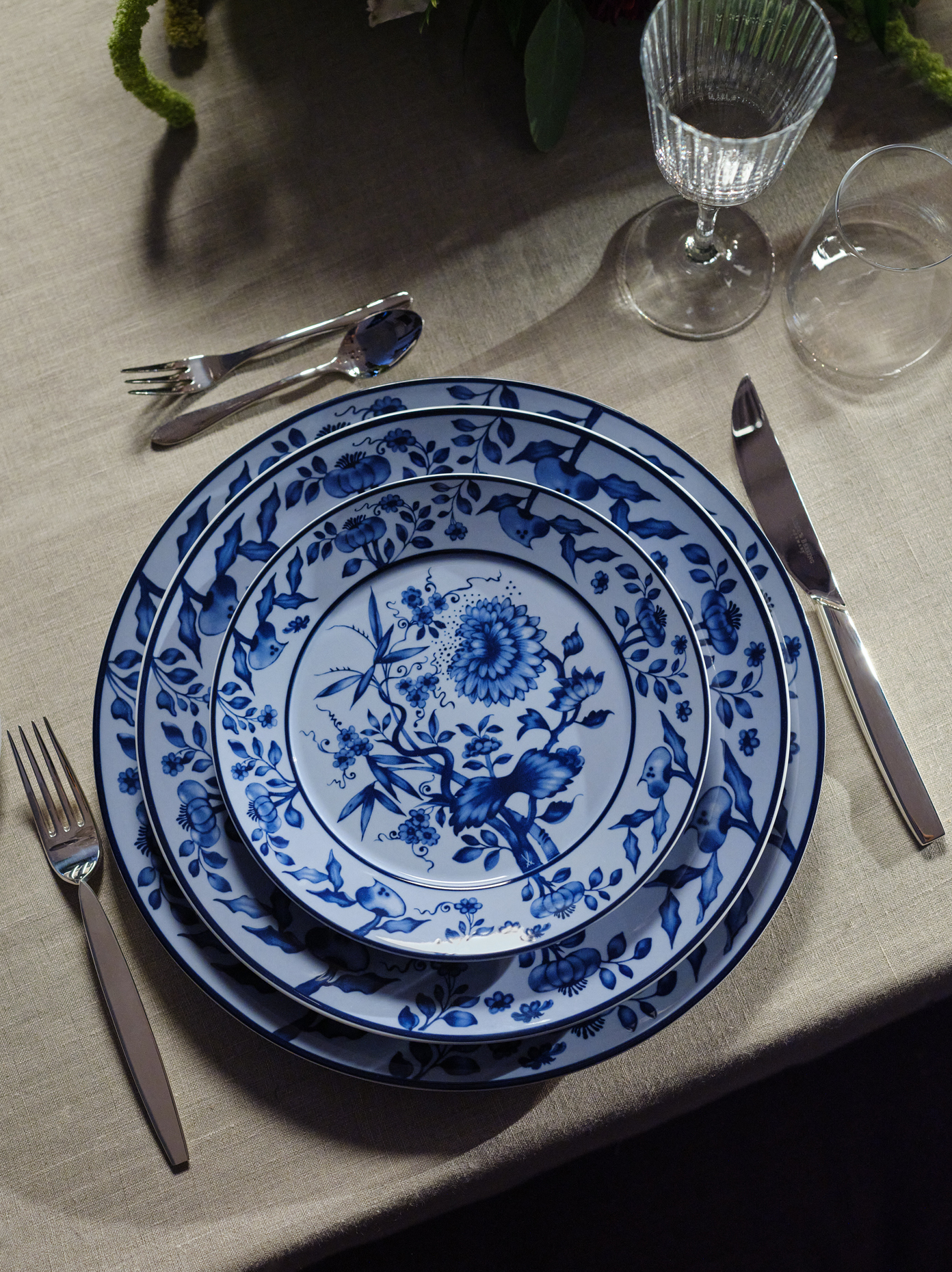 European porcelain was born in 1710 with the founding of the MEISSEN Porcelain Manufactory by Augustus the Strong, Elector of Saxony. The manufactory was the first in Europe to unlock the secret of porcelain production. Just a few years after it was founded, the blue onion pattern was developed in Meissen (around 1739). In contrast to its Far Eastern models, however, the MEISSEN blue onion was not an exact copy. Rather, it was a stylized, Europeanized version of the Chinese decorations. The name “blue onion” is misleading, as the original motifs did not depict onions, but peaches, melons and bamboo plants, which looked like onions to European eyes. The patterns were classically executed in cobalt blue underglaze painting, which is still considered a characteristic feature of this decoration today.