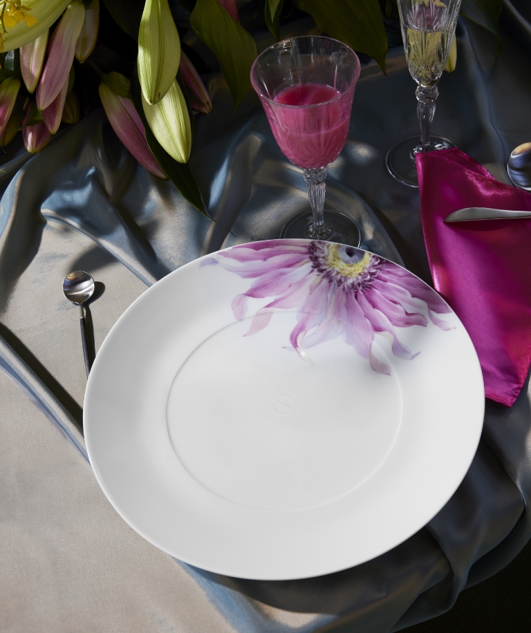 The new trend colour goes ideally with white or cream and, in the right composition, creates an almost magical ambience on the table at home. Deliberately combine a blue-violet tablecloth with our "Giant Bloom" service, violet napkins and golden cutlery. You will notice how the strong violet accents in combination with the delicate colouring of the large-scale flower painting seem to be able to open a door to another world full of fantasy and magic.